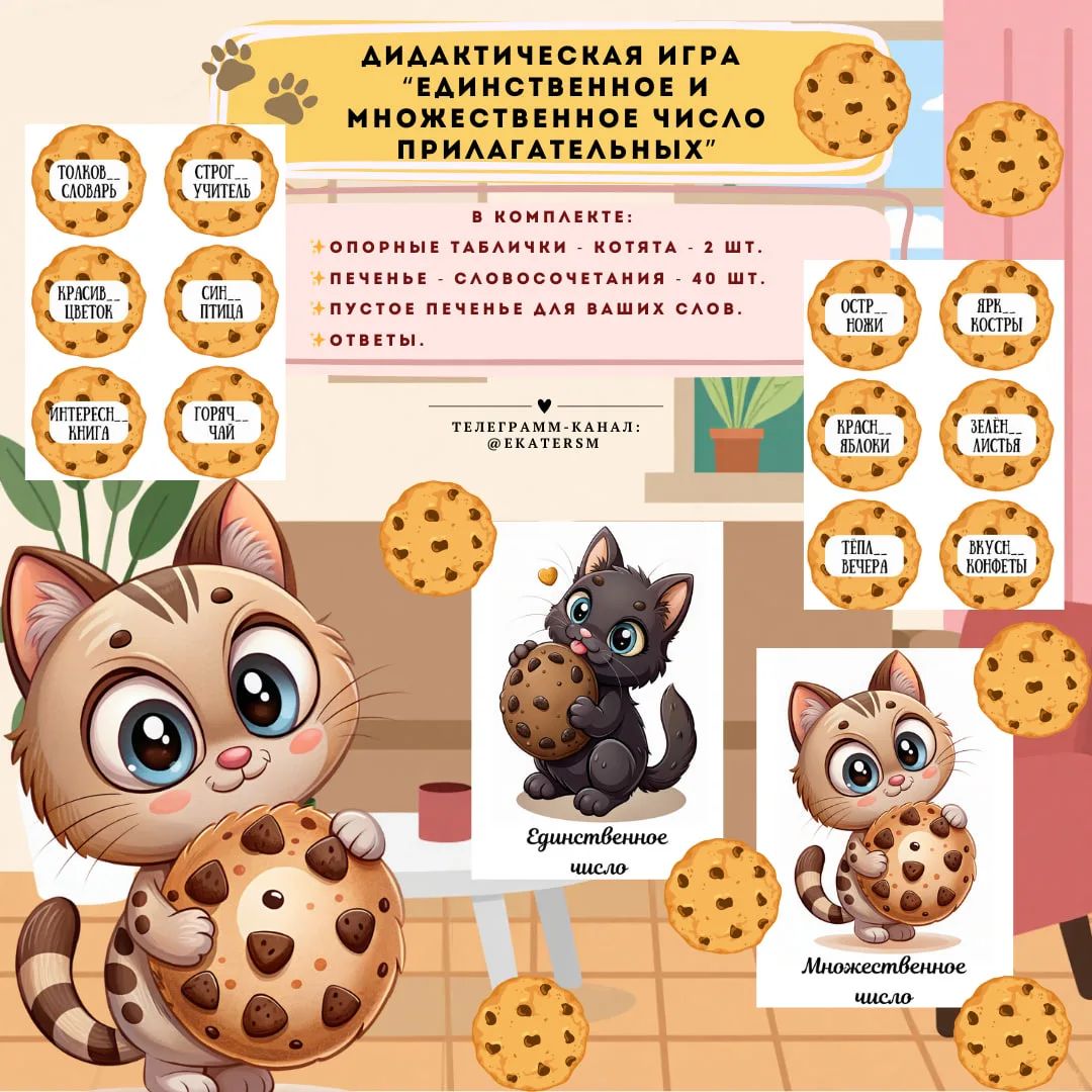 Дидактическая игра для печати «Единственное и множественное число прилагательных» - Котята. 🍪