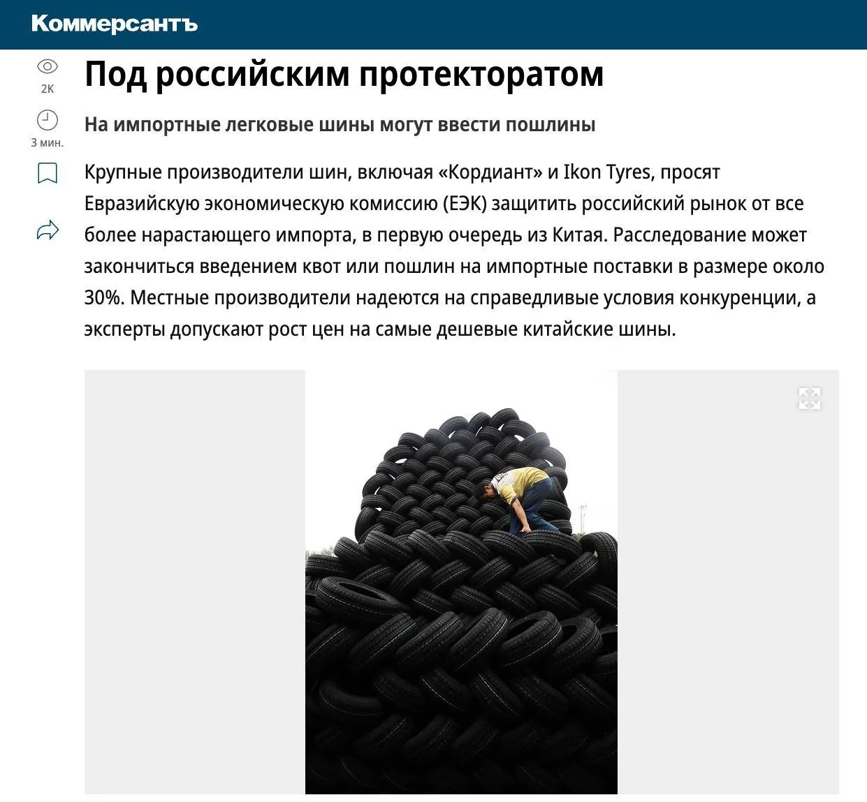 На импортные шины для легковых авто хотят ввести 30%-е пошлины — СМИ. Об этом попросили российские производители шин, чтобы защитить рынок РФ от импорта. Среди заявителей «Кордиант», «Кама», Ikon Tyres и «Белшина». Это приведёт к взлёту цен для потребителей, предупреждают эксперты