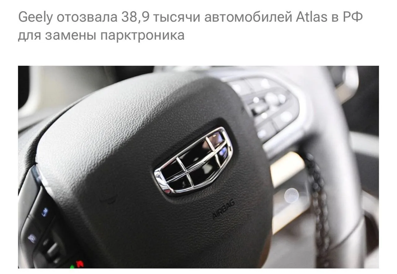 Geely отзовет почти 40 тысяч автомобилей в России из-за технической неисправности. Компания Geely Motors отзовет 38,9 тысячи автомобилей модели Atlas для замены предохранителя парковочного ассистента. Об этом заявили в пресс-службе компании