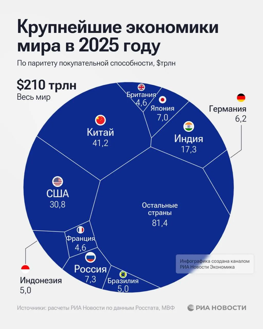 Россия по итогам 2025 года сохранила четвертое место среди крупнейших экономик мира. Её ВВП по паритету покупательной способности впервые превысил отметку в $7 трлн