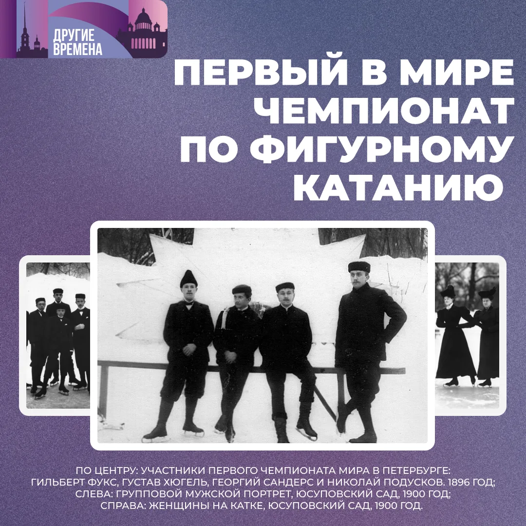 Сегодня в рубрике #ДругиеВремена мы с вами переносимся на 130 лет назад, в 1896 год, и оказываемся в Юсуповском саду, где прошёл первый чемпионат мира по катанию на коньках ⛸️⛸️⛸️