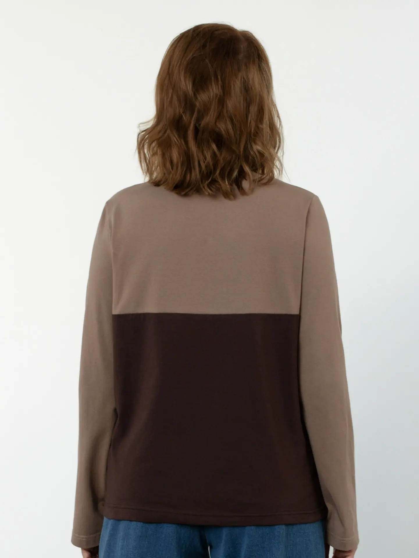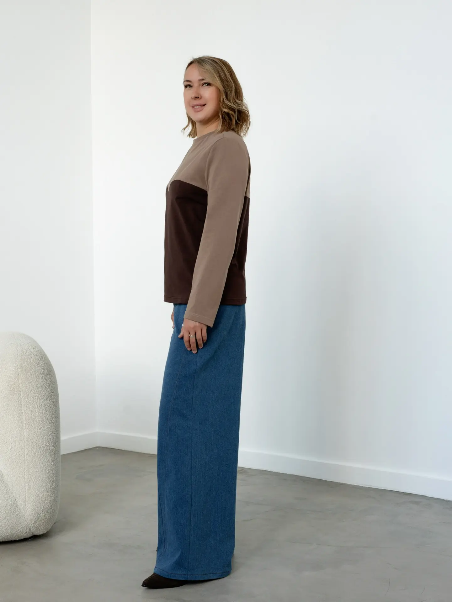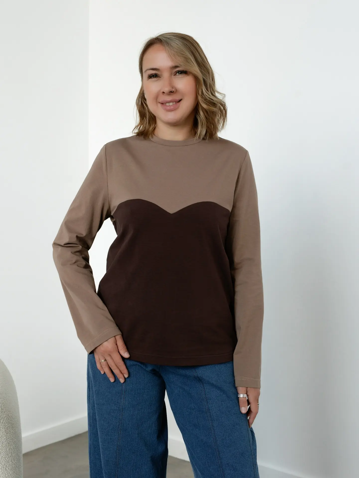 Модель Елена, лонгслив 44 размера рост 170 см, реальный размер (на момент фотосессии) по обхвату груди 44 рост 167 см. Параметры тела: ОГ 87 см, ОТ 72 см, ОБ 96 см. Размер выбран по обхвату груди. Сшит из трикотажа кулирка с эффектом флам, состав 100% хлопок, плотность 135г/м2. Также на Елене джинсы по выкройке «Донна».
