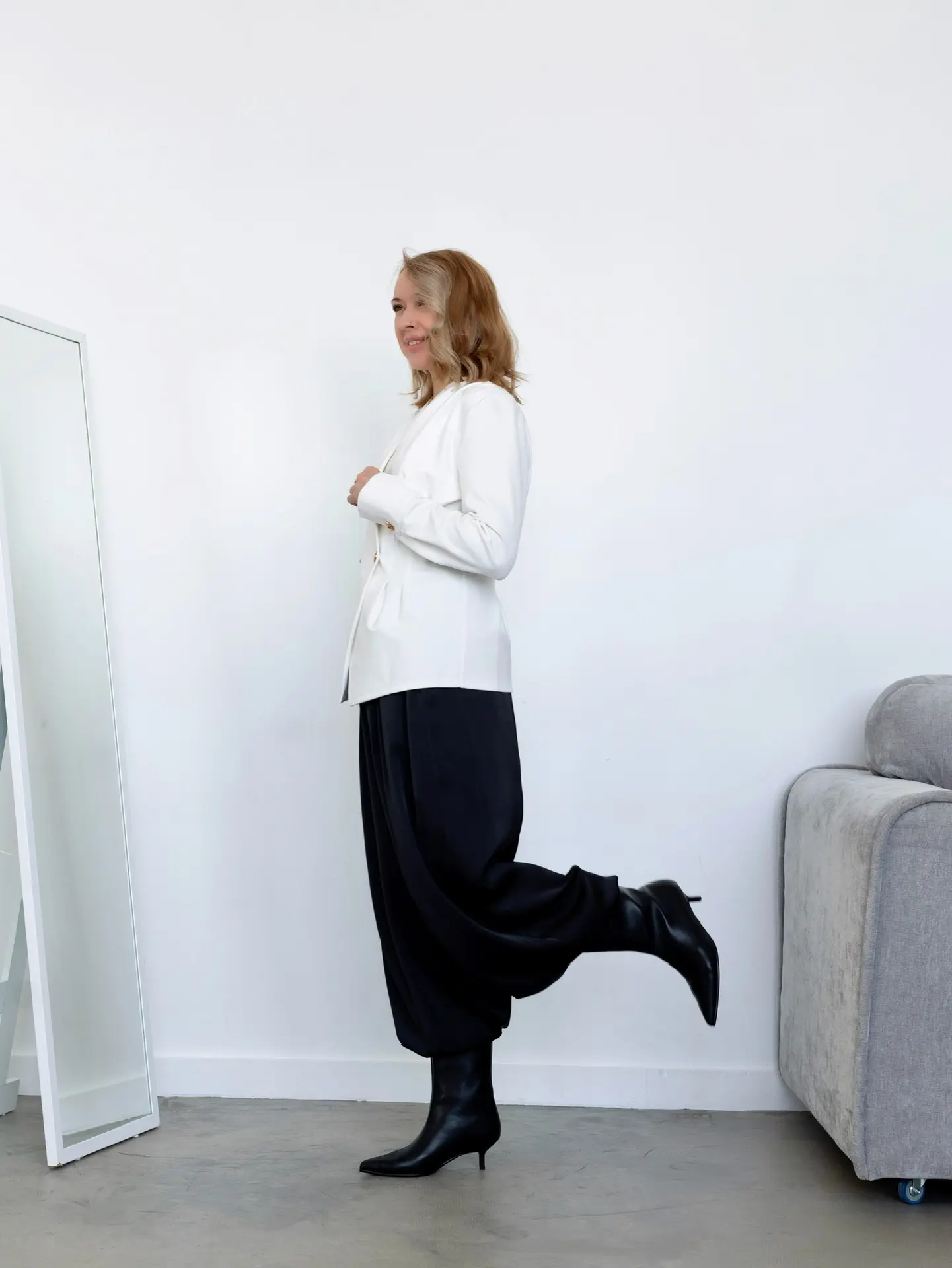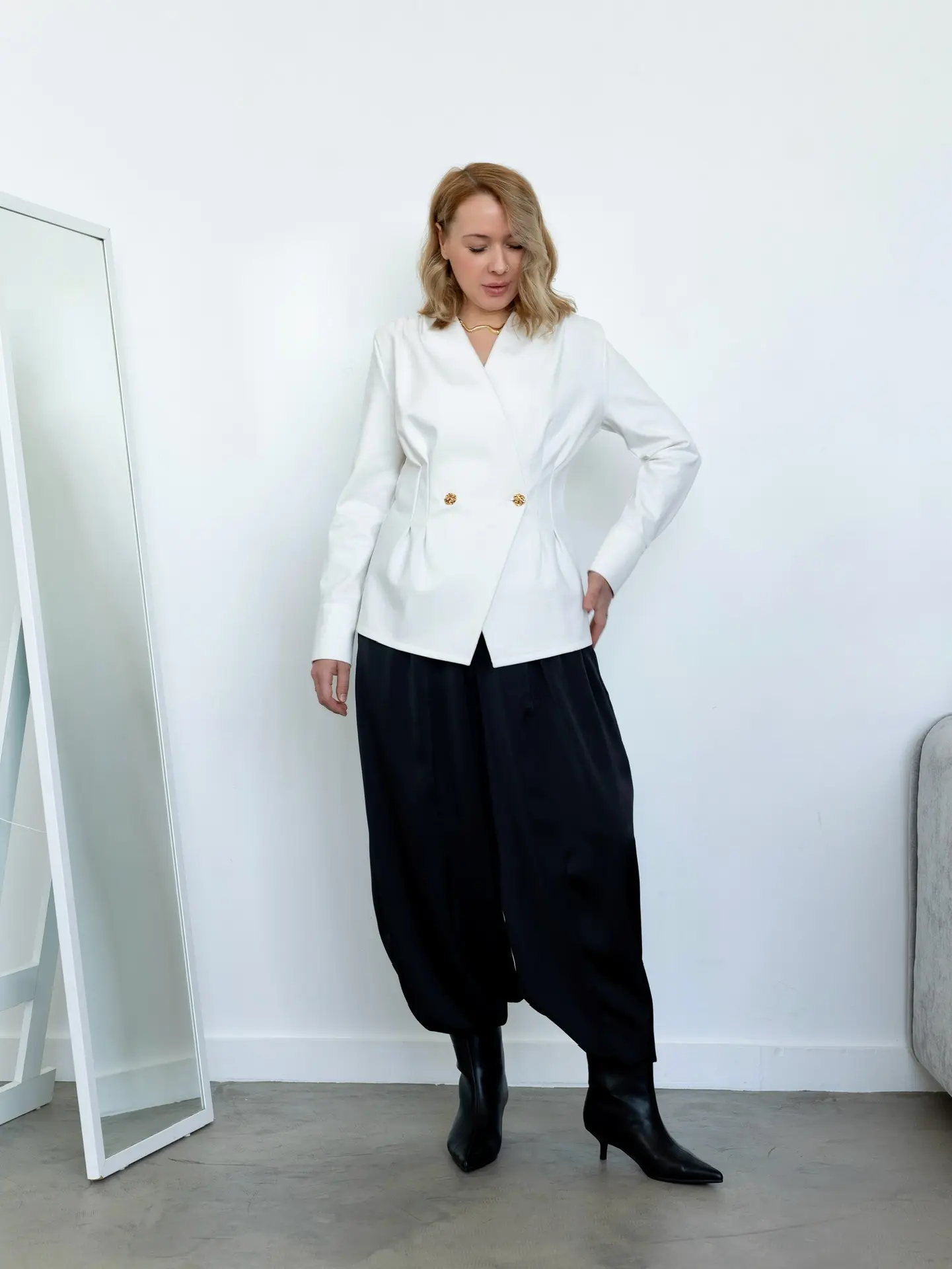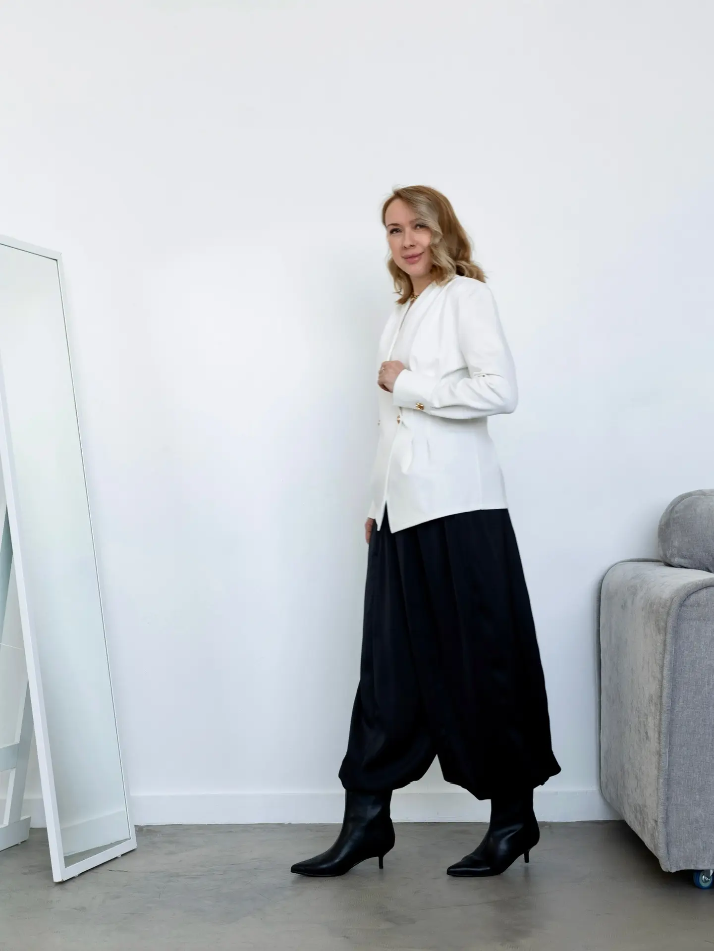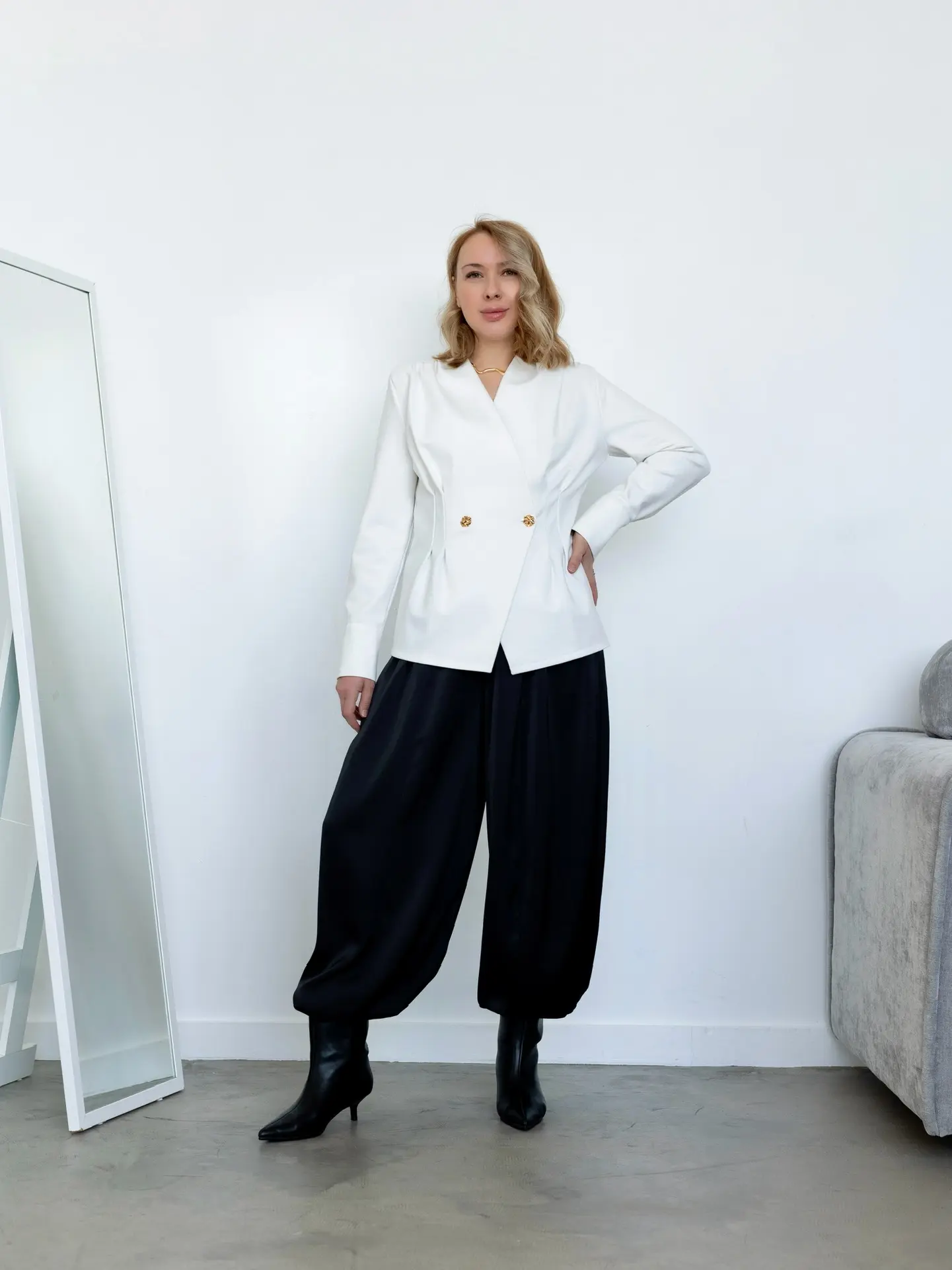 Модель Елена, брюки 44 размера рост 170 см, реальный размер (на момент фотосессии) по обхвату груди 44 рост 167 см. Параметры тела: ОГ 87 см, ОТ 72 см, ОБ 96 см. Размер выбран 44 по обхвату бедер. Черные брюки сшиты из ткани «Дубайский шелк», состав: 100% пэ, плотность: 195 гр/м2. Светло-желтые брюки сшиты из вареного 100% хлопка. Также на Елене жакет по выкройке «Кесседи».