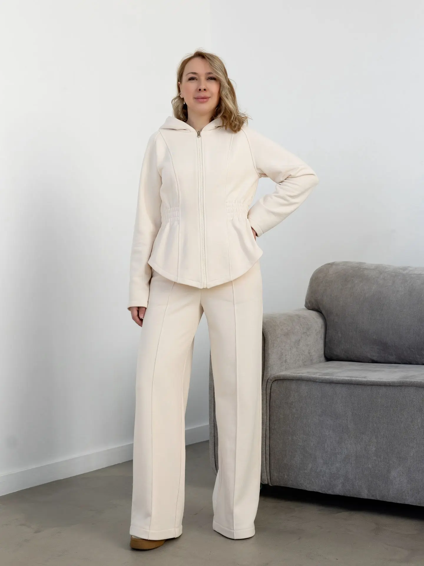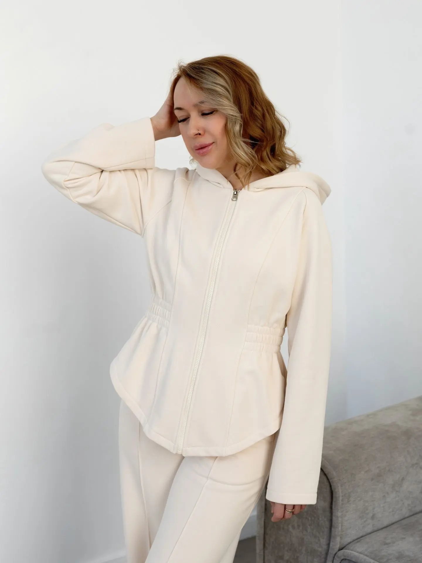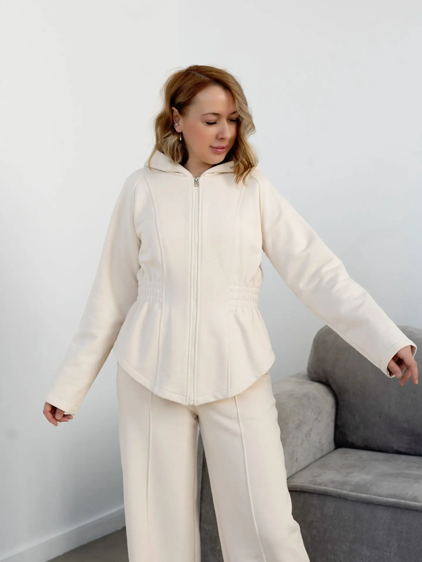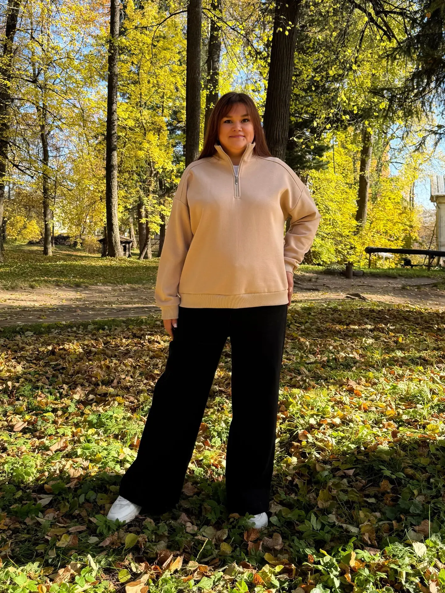 Толстовка и брюки 44 размера рост 170 см, реальный размер (на момент фотосессии) по обхвату груди 44 рост 167 см. Параметры тела: ОГ 87 см, ОТ 72 см, ОБ 96 см. Размер выбран 44 по обхват груди. Сшита из футера трехнитки диагональ, плотность: 320 гр/м2, состав: 85% хлопок, 15%пэ. Трикотаж (цвет кокос) и молния из магазина https://vk.com/club219182622