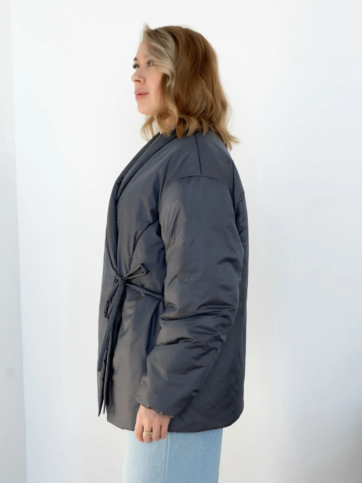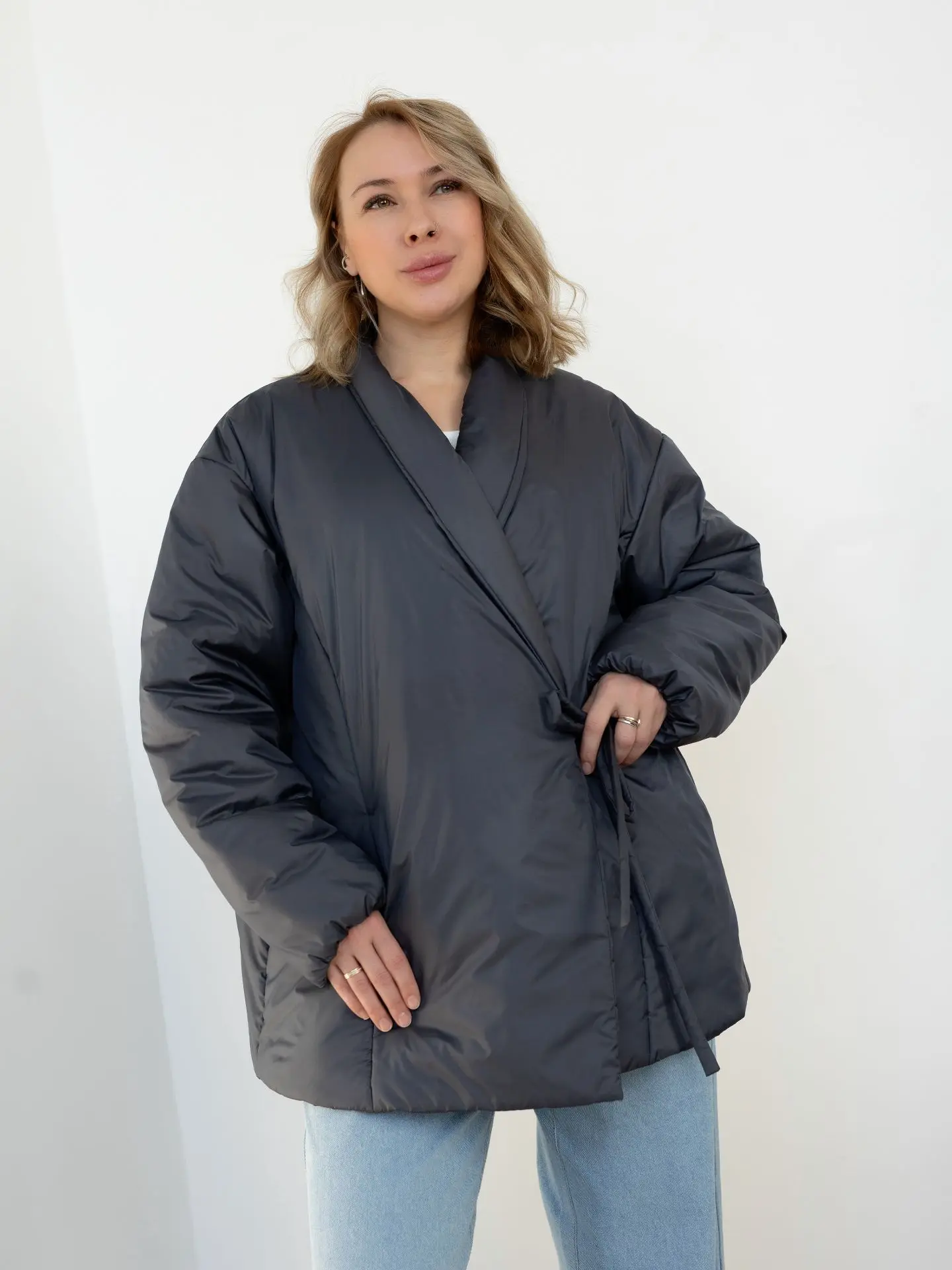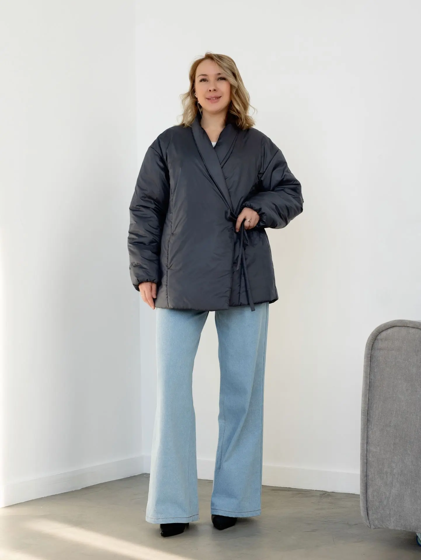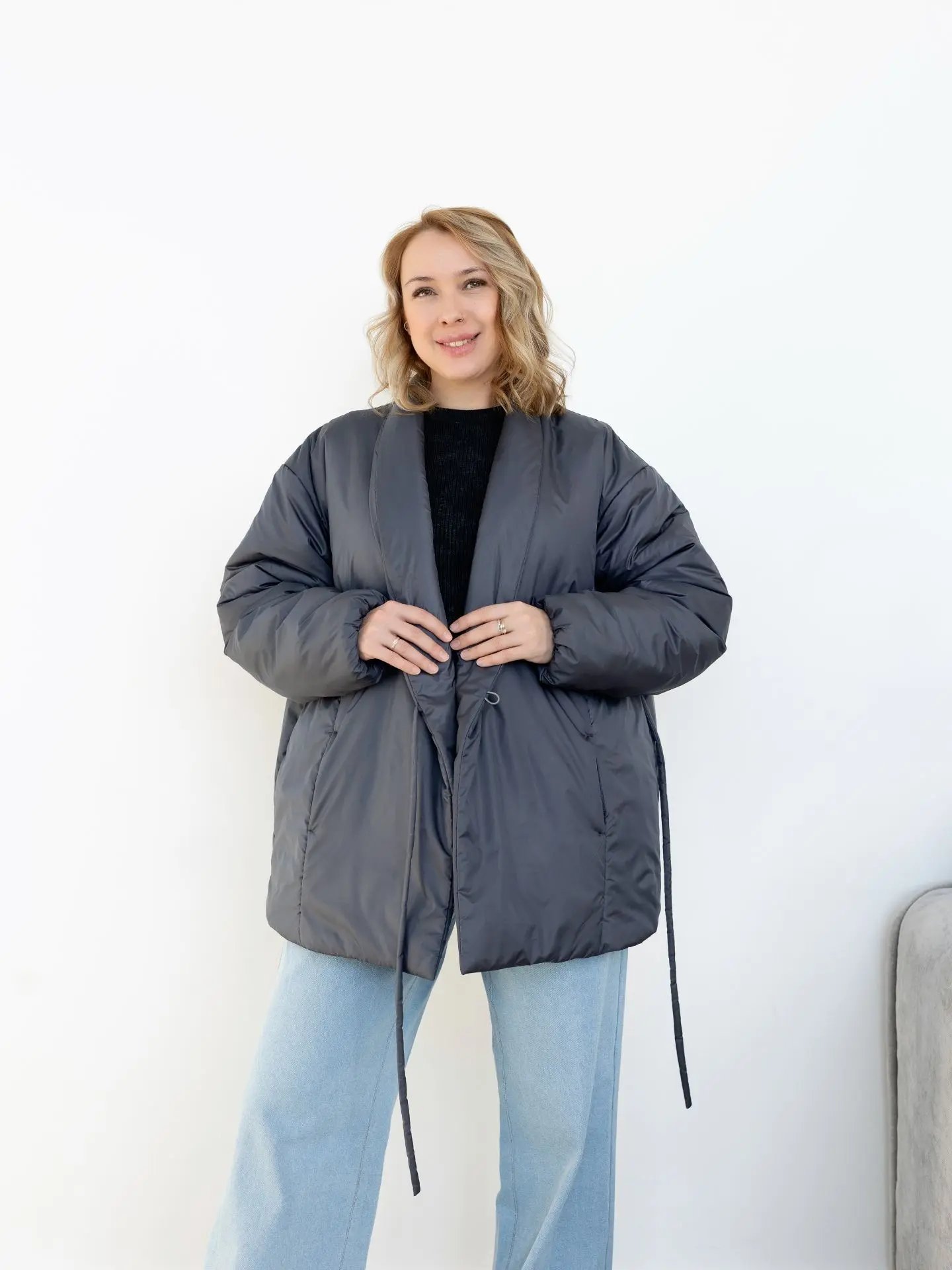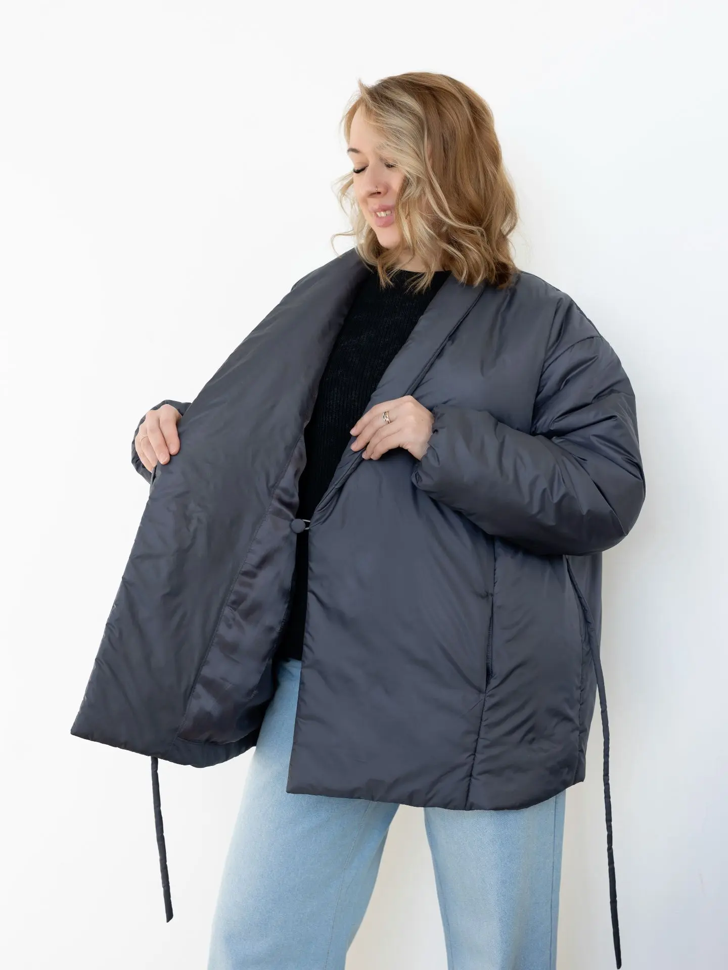 Женская утепленная куртка свободного кроя, прямого силуэта, шалевый воротник, линия плеча спущена, длинный рукав, низ рукава собран на резинку, на полочках нагрудные вытачки переведены в рельефные швы, в рельефных швах полочек карманы, застежка на запах, фиксируется двумя завязками снаружи, пуговицей и петлей внутри, длина куртки ниже линии бедер.