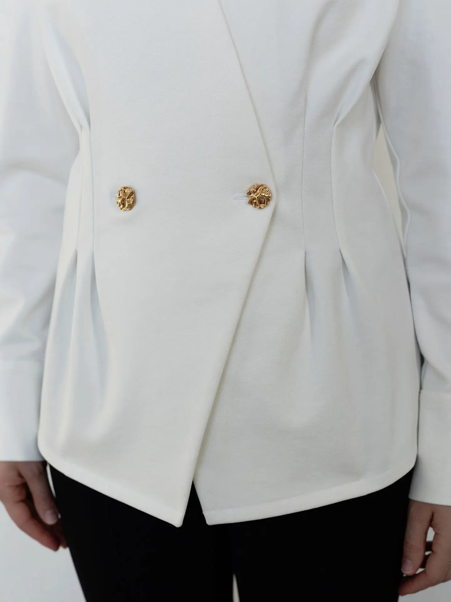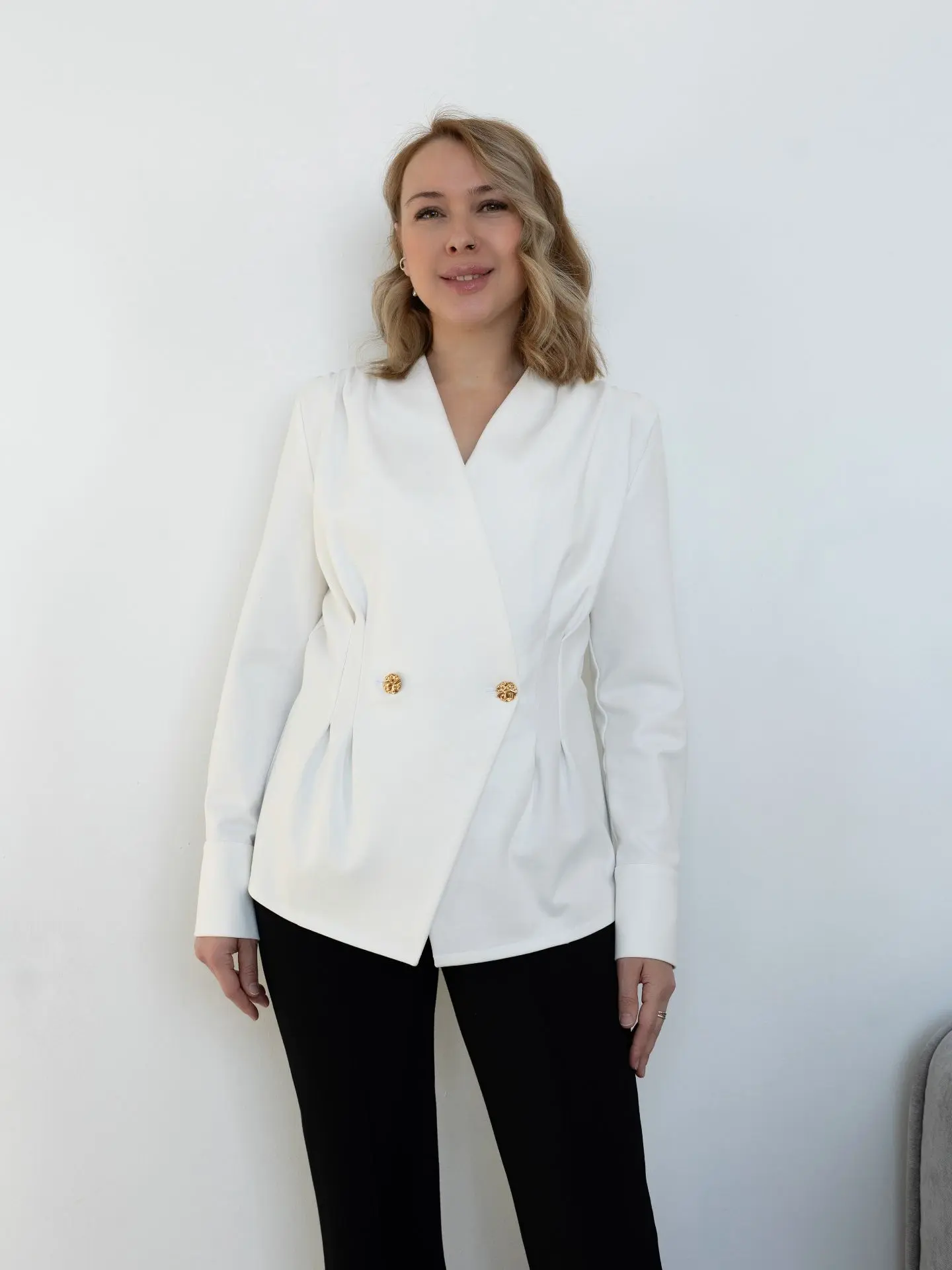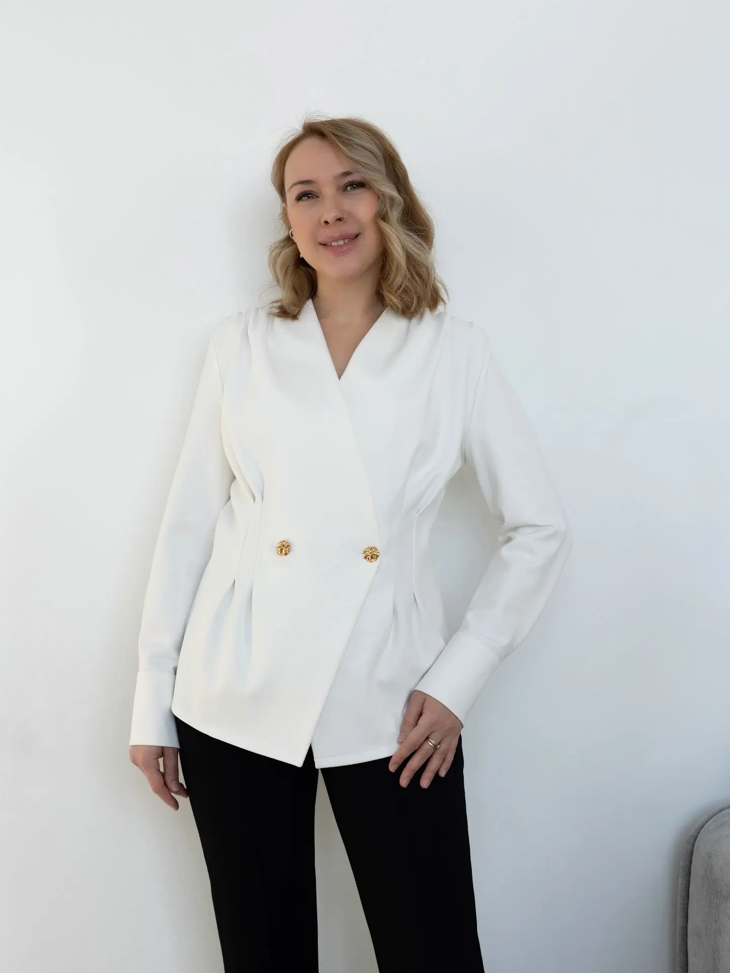 Женский трикотажный двубортный жакет среднего объема, полуприлегающего силуэта, приталивание создается за счет складок по талии, длинный втачной рукав, низ рукава оформлен широкой притачной манжетой, которая застегивается на пробивную петлю и пуговицу на ножке, V-образный вырез горловины переда, по переду асимметричная центральная застежка на две пробивные петли и пришивные пуговицы на ножке, по плечевым швам переда сборка, длина жакета до линии бедер.