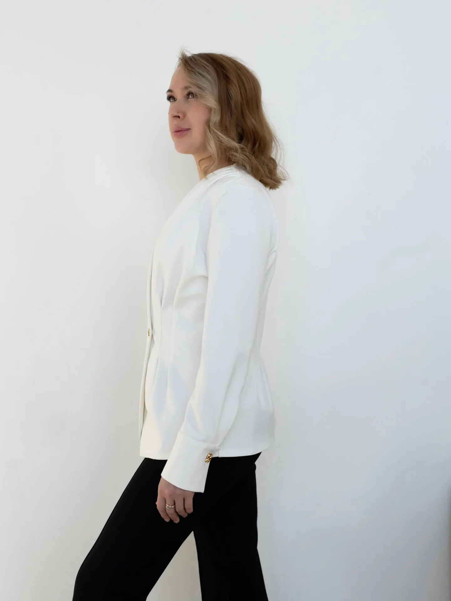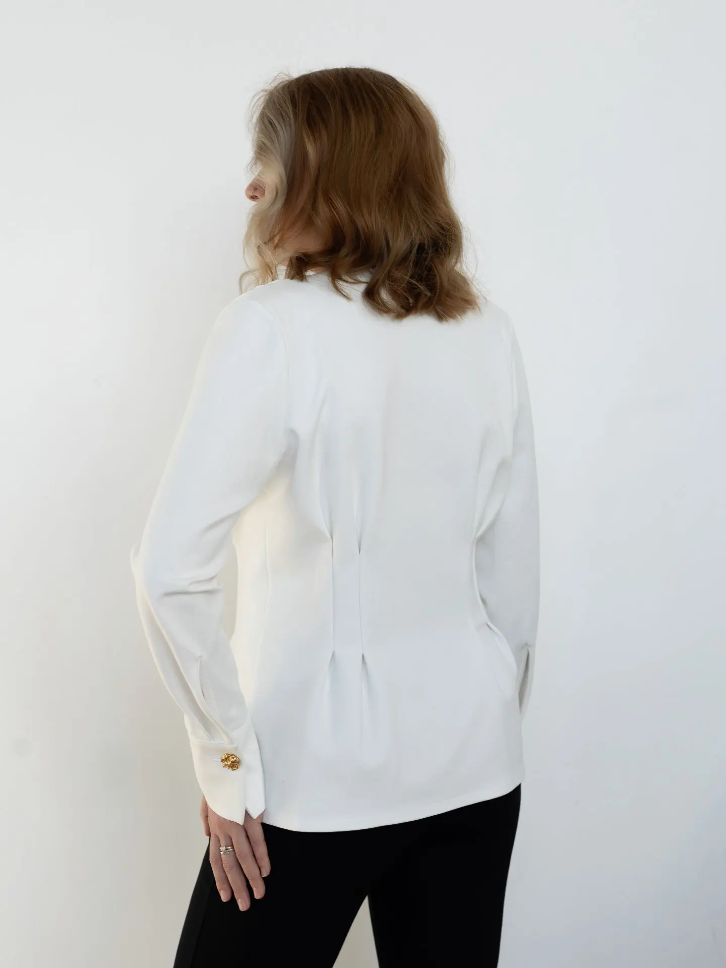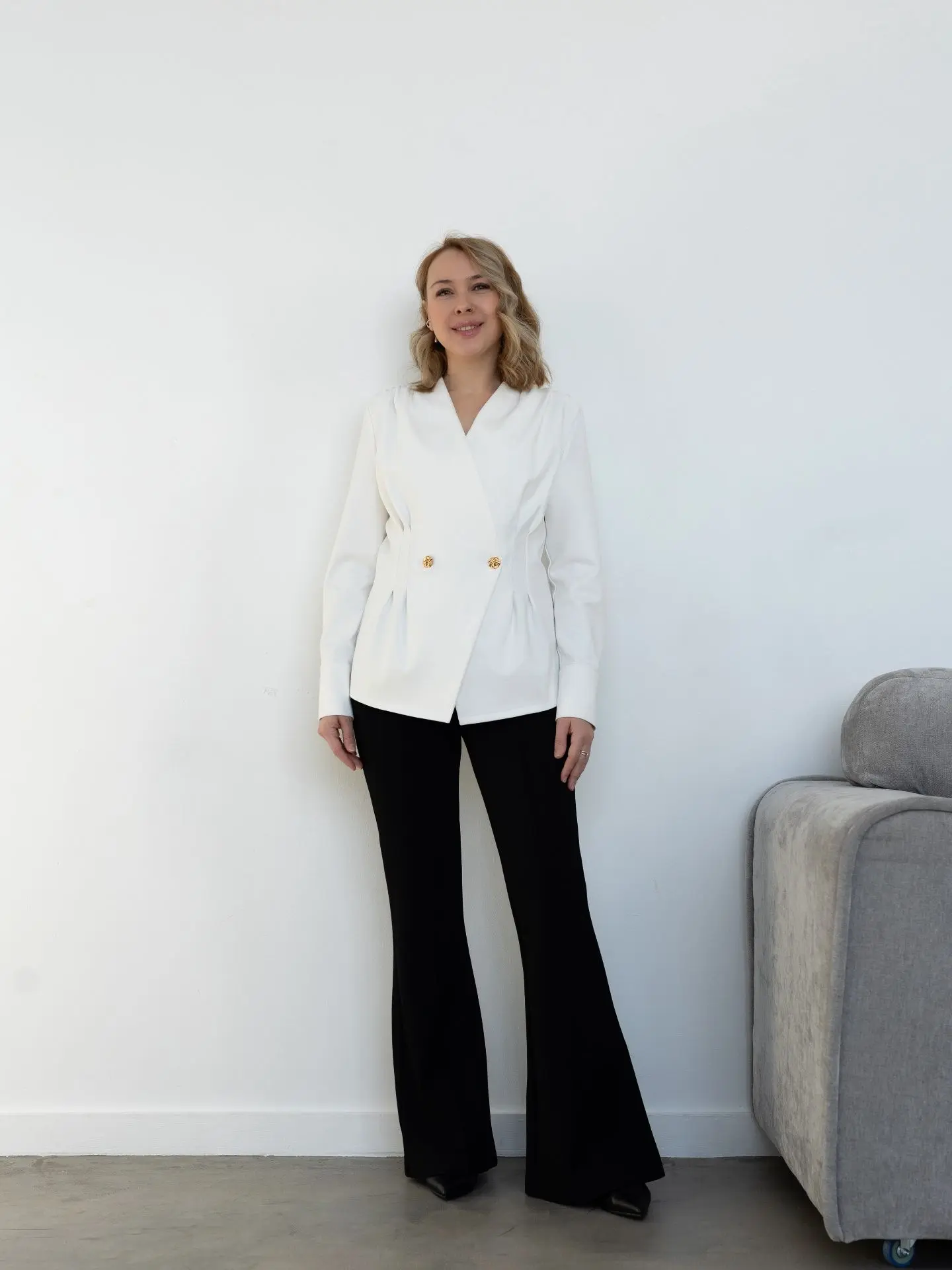 Женский трикотажный двубортный жакет среднего объема, полуприлегающего силуэта, приталивание создается за счет складок по талии, длинный втачной рукав, низ рукава оформлен широкой притачной манжетой, которая застегивается на пробивную петлю и пуговицу на ножке, V-образный вырез горловины переда, по переду асимметричная центральная застежка на две пробивные петли и пришивные пуговицы на ножке, по плечевым швам переда сборка, длина жакета до линии бедер.