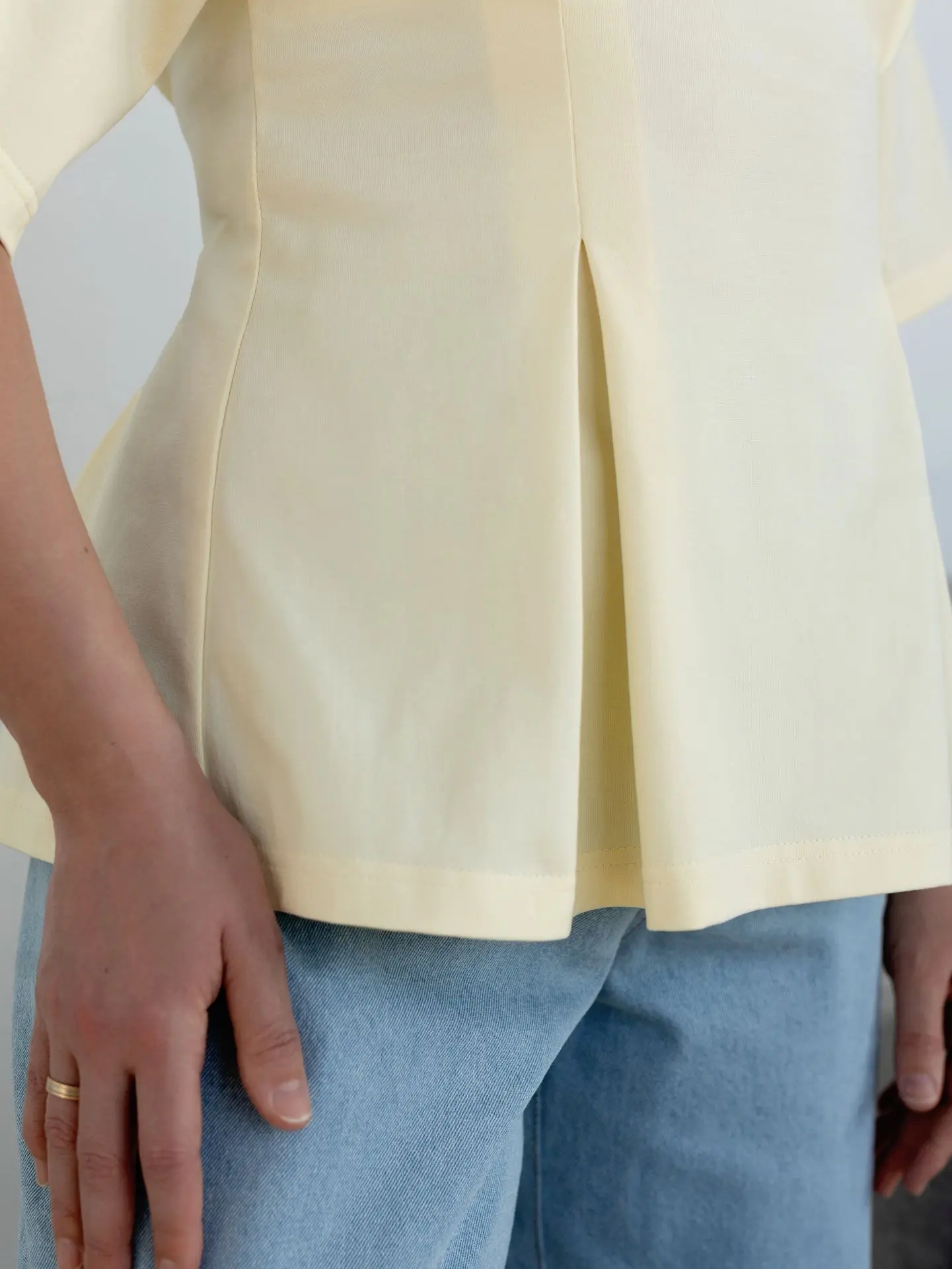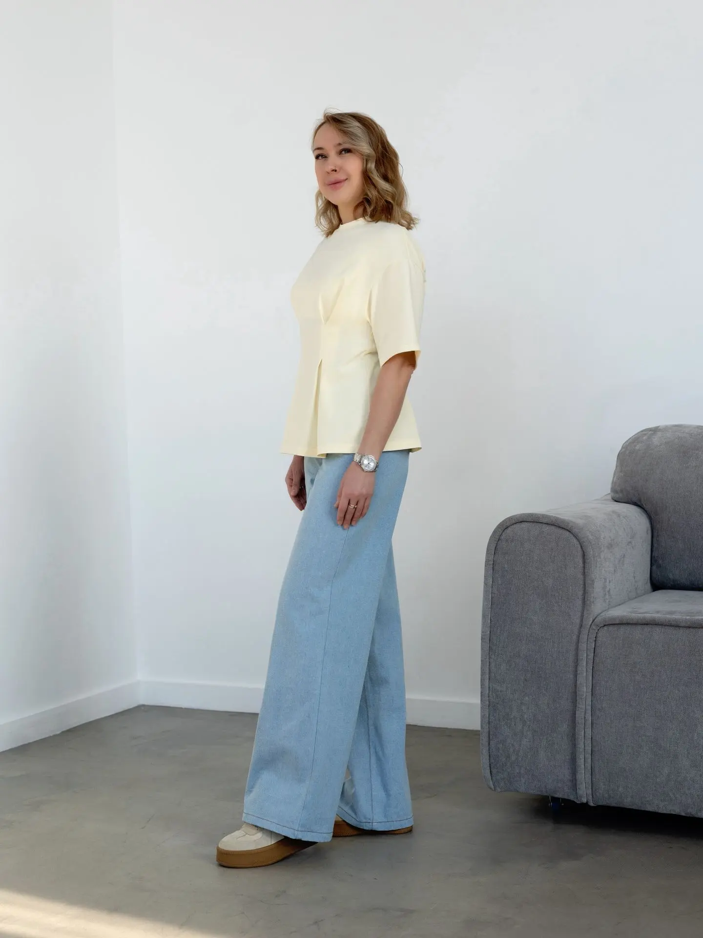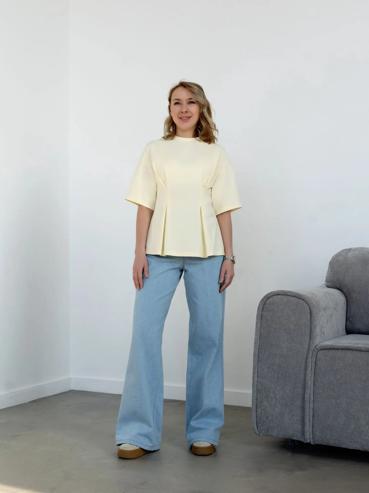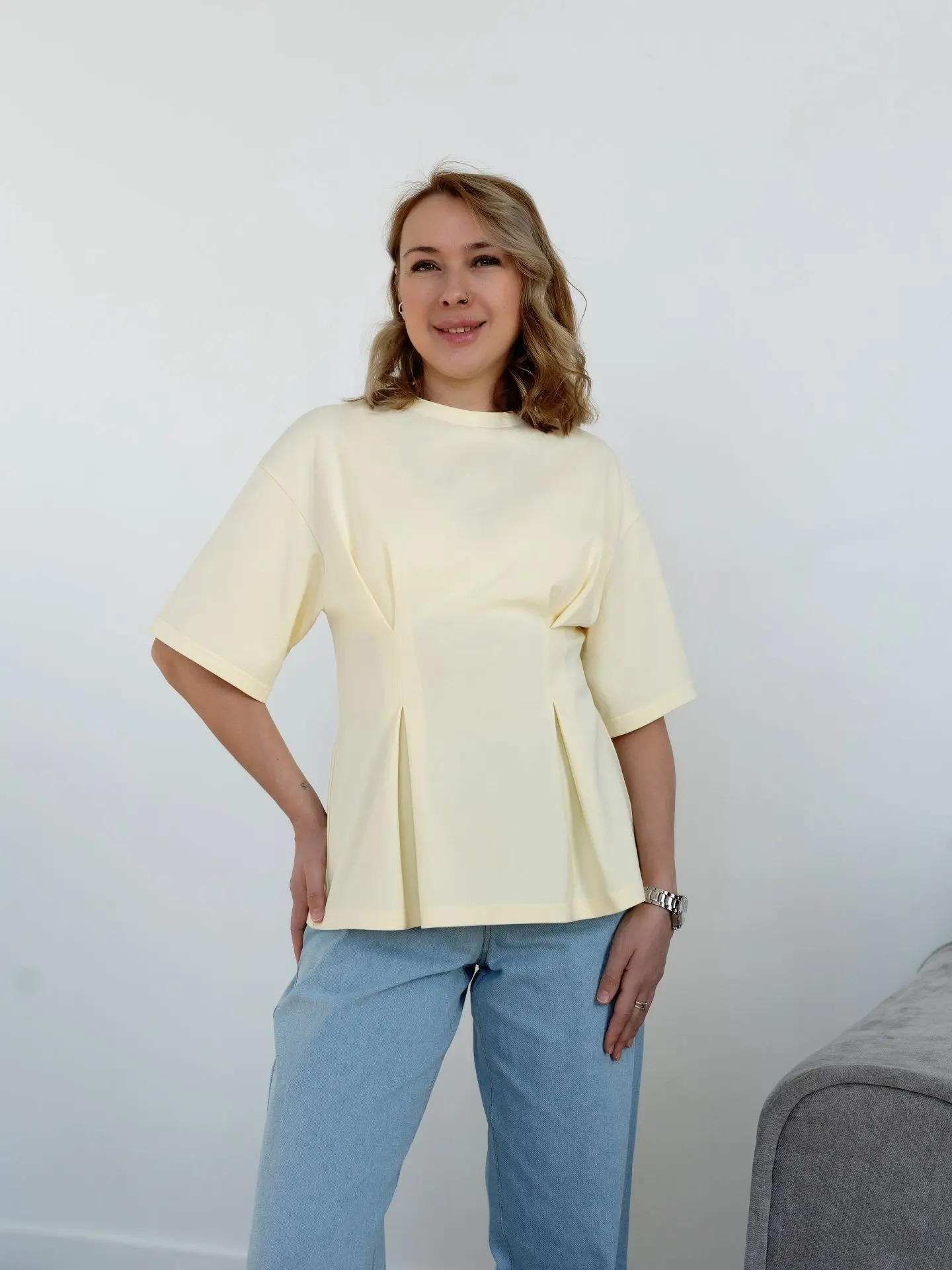 Женская трикотажная свободная футболка, приталенная за счет складок по талии переда и спинки, линия плеча спущена, короткий рукав, горловина округлой формы и обработана обтачкой из основного трикотажа, длина изделия немного выше линии бедер.