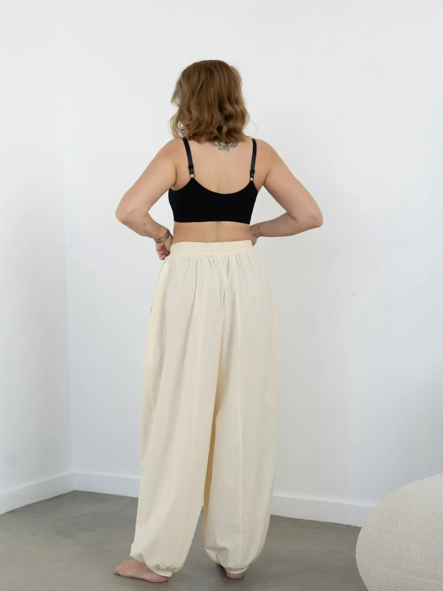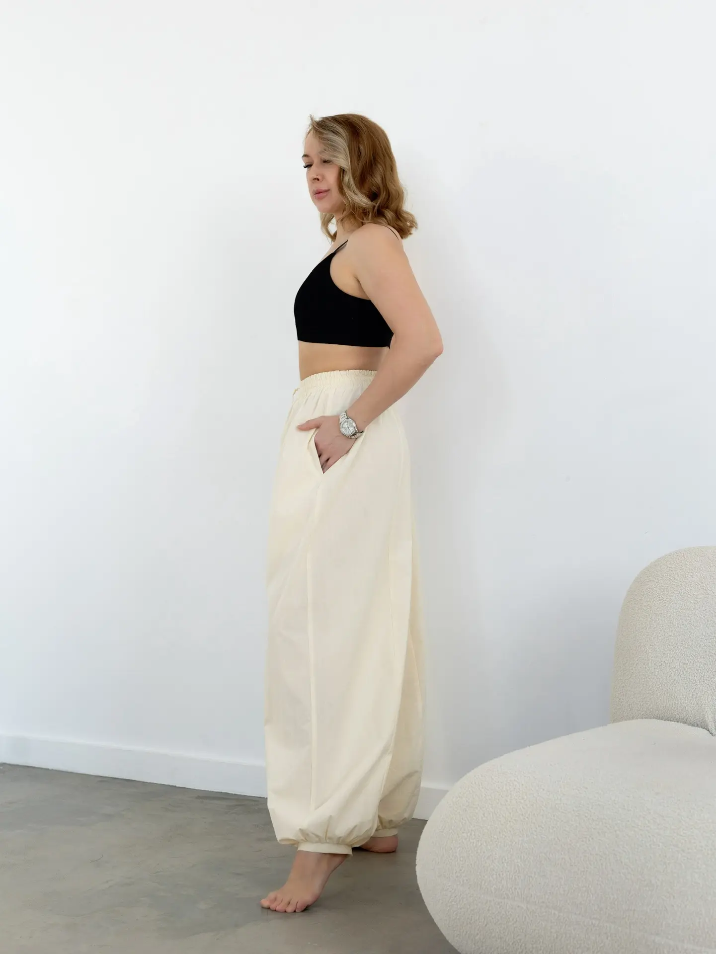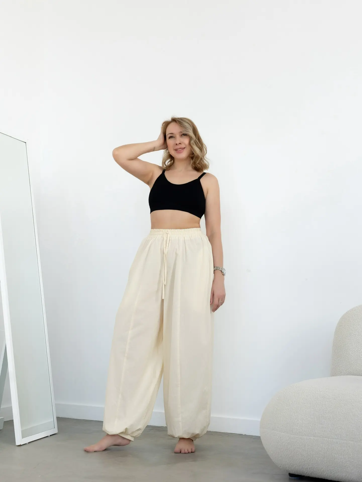 Женские брюки широкого кроя, на передних и задних половинках вертикальные подрезы, брюки немного заужены к низу, низ брюк на сборке, по низу притачная узкая манжета из основной ткани, верх брюк обработан притачным поясом из основной ткани с широкой резинкой внутри, пояс отстрочен двумя строчками, на поясе пробиты две петли, через которые продет шнур, карманы в боковых швах.