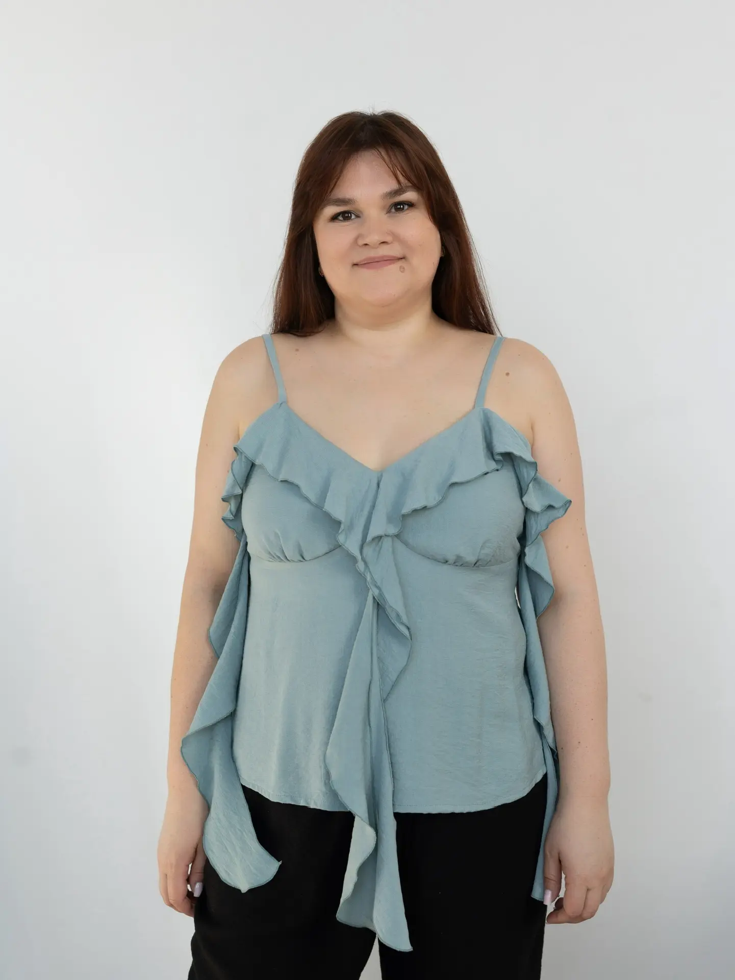 Женский топ на широких бретелях, с лифом прилагающего силуэта, отрезной по линии талии, нижняя часть топа кроя «баллон», по переду и спинке вертикальные рельефы, по центру спинки застежка на потайную молнию.