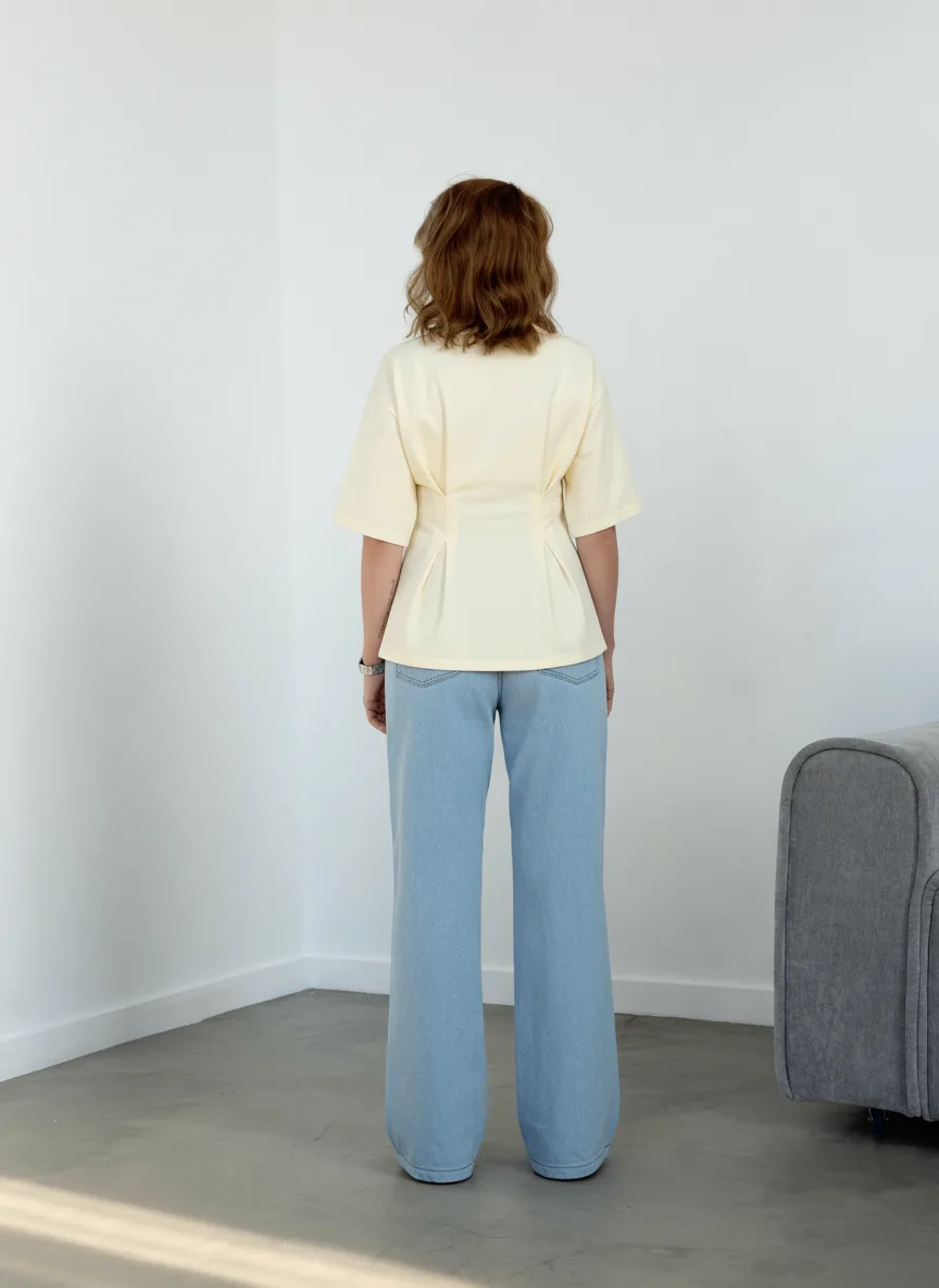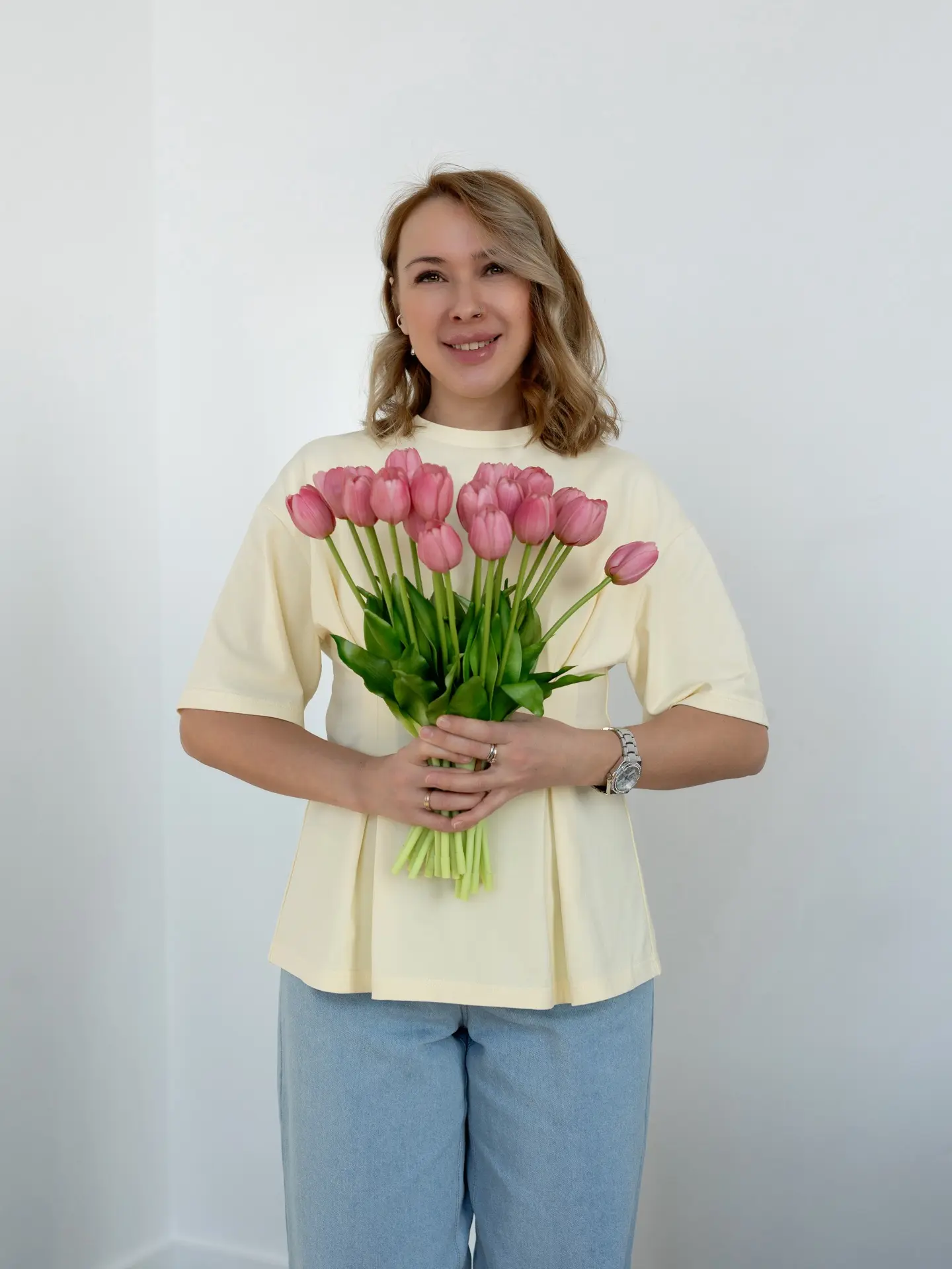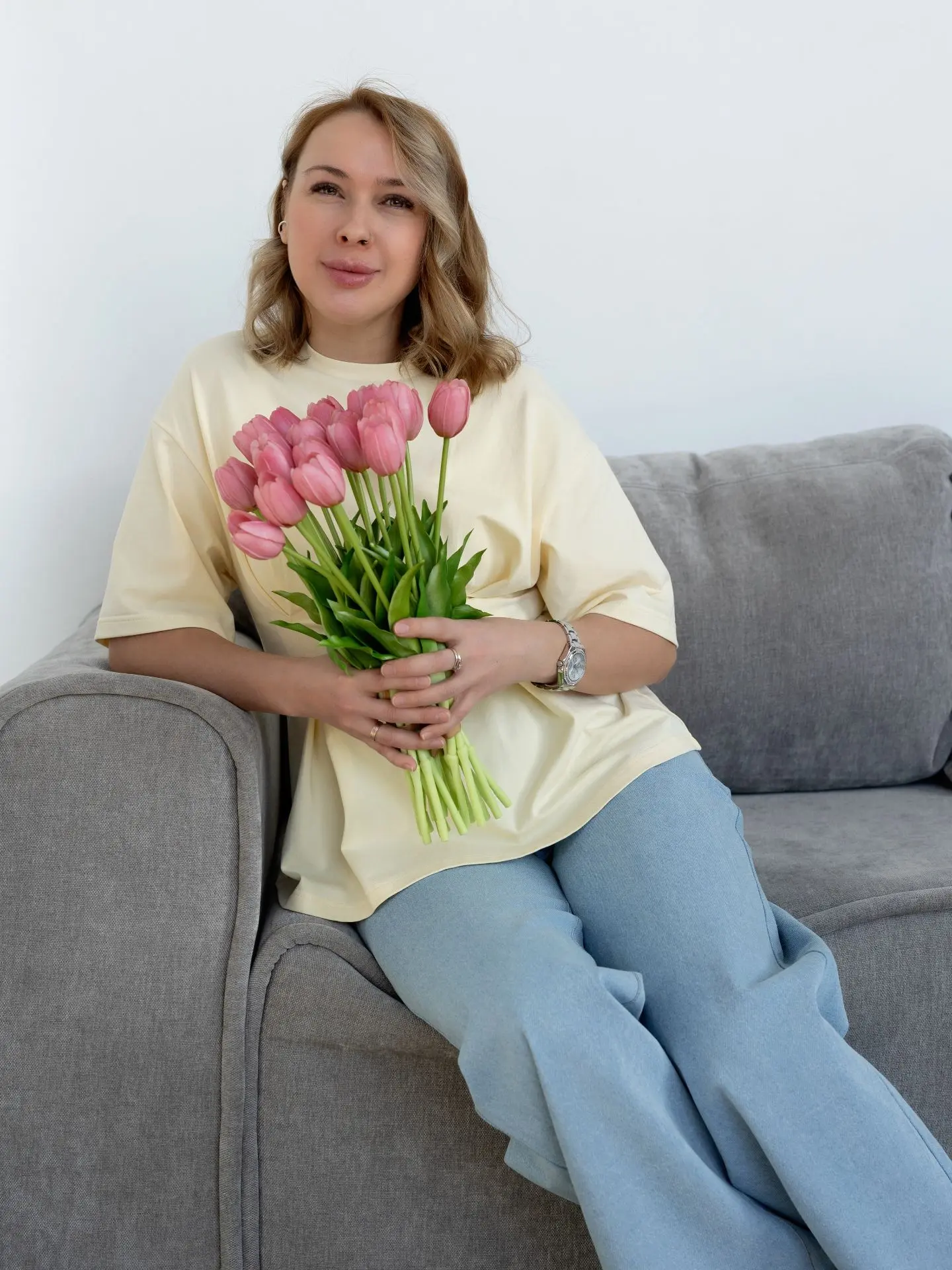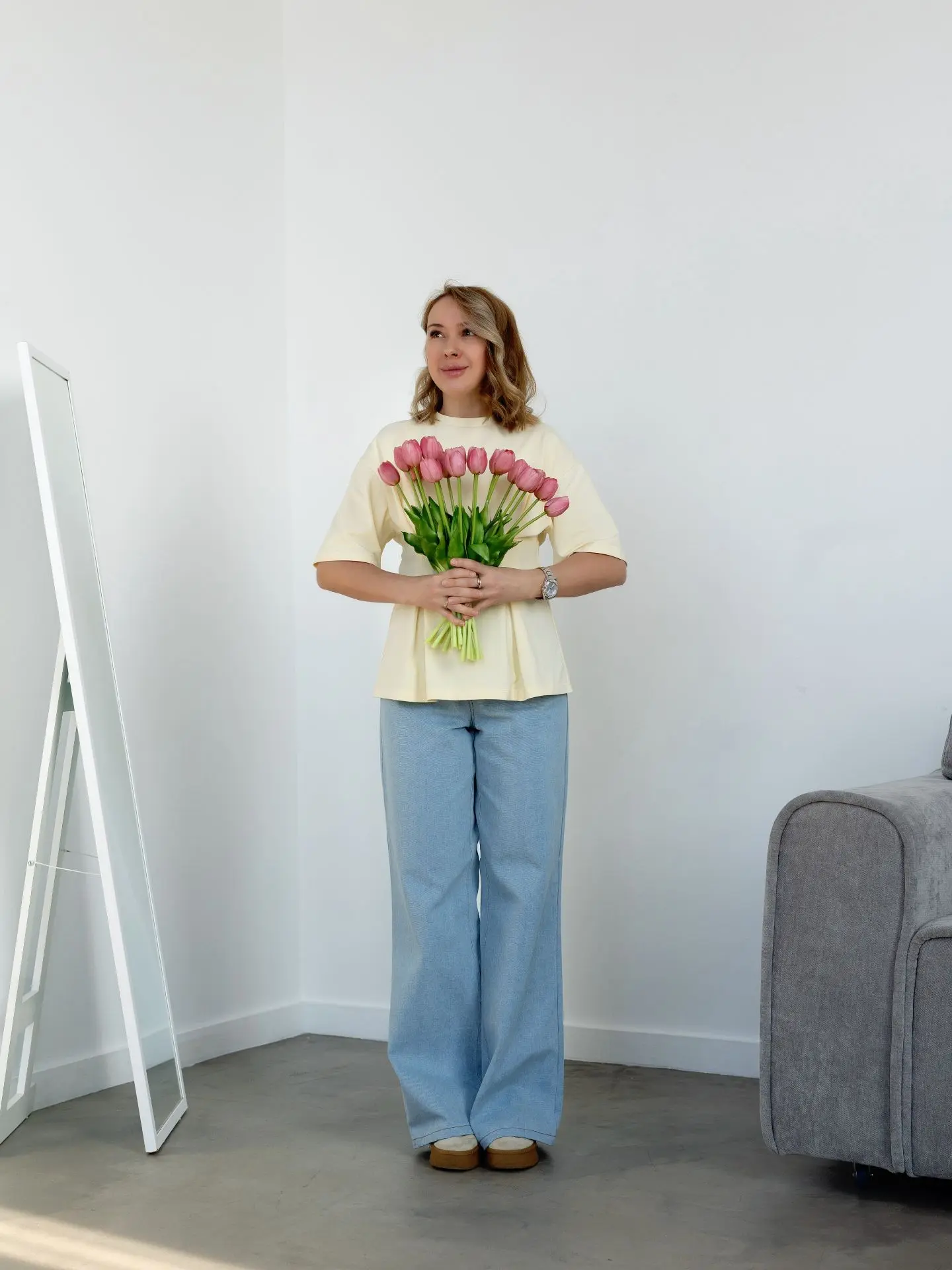 Модель Елена, футболка 44 размера рост 170 см, реальный размер (на момент фотосессии) по обхвату груди 44 рост 167 см. Параметры тела: ОГ 87 см, ОТ 72 см, ОБ 96 см. Размер по обхвату груди. Сшита из кулирки с лайкрой плотность: 220 гр/м2, цвет: сливочное масло. Также на Елене джинсы по выкройке «Донна».