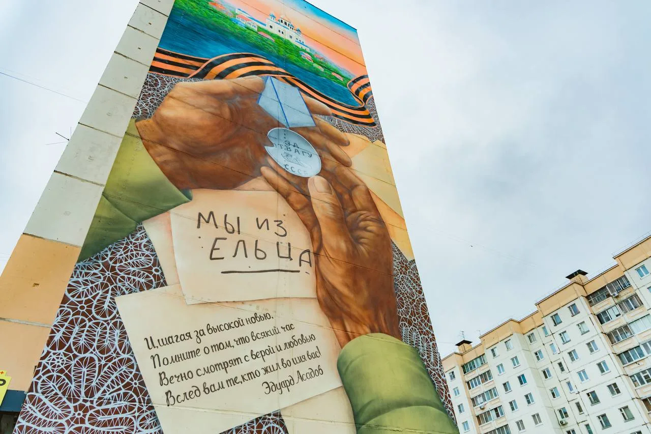 Рисунки величиной с многоэтажки. На одном – Вознесенский собор, елецкие кружева, легендарная надпись с Рейхстага, на другом – старинный Елец как из русской сказки, что говорит о древних корнях и богатой истории города. Будет ещё третье изображение, посвящённое нынешним защитникам.