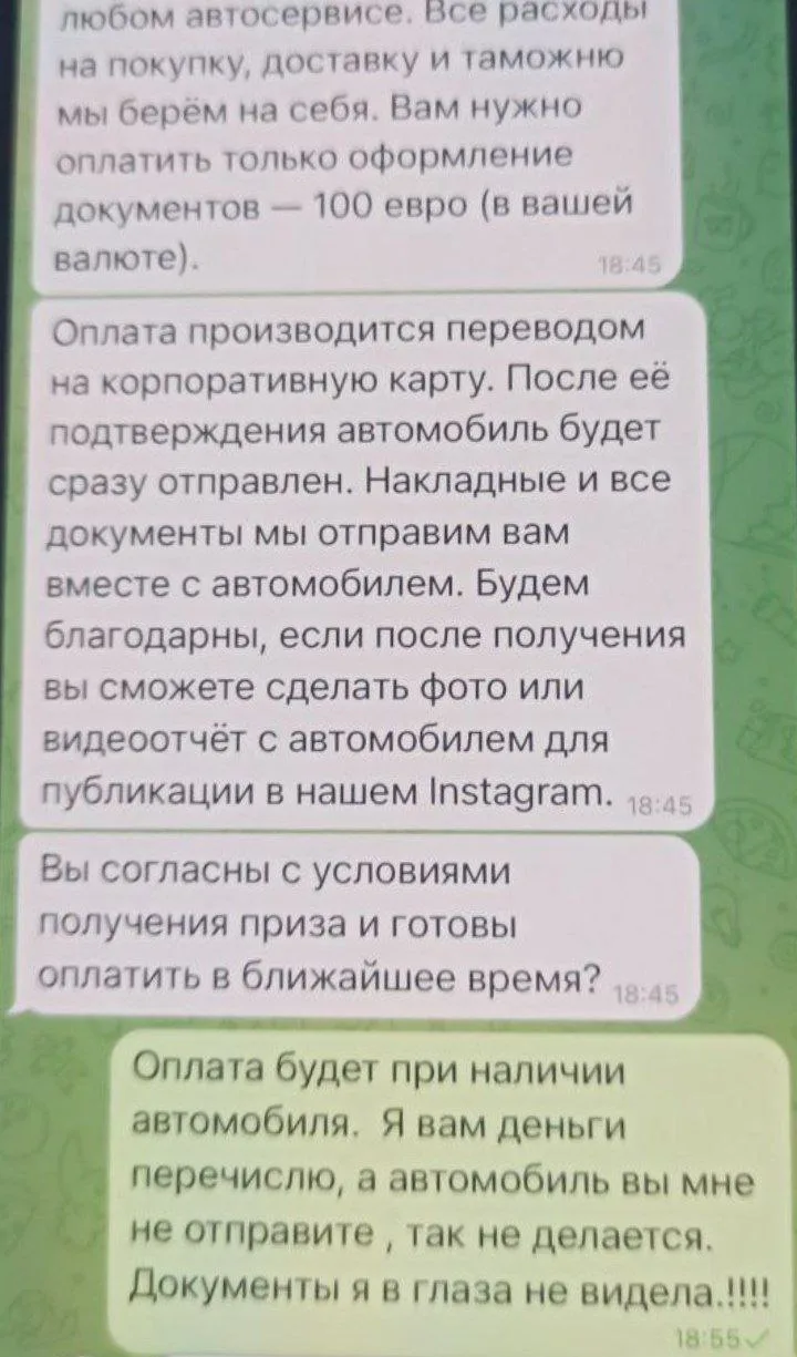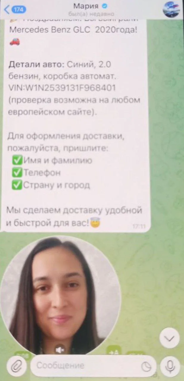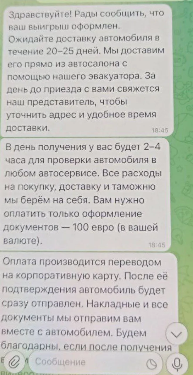💬 После этого подписчикам в личные сообщения приходит «радостная новость»: «Вы выиграли автомобиль!»