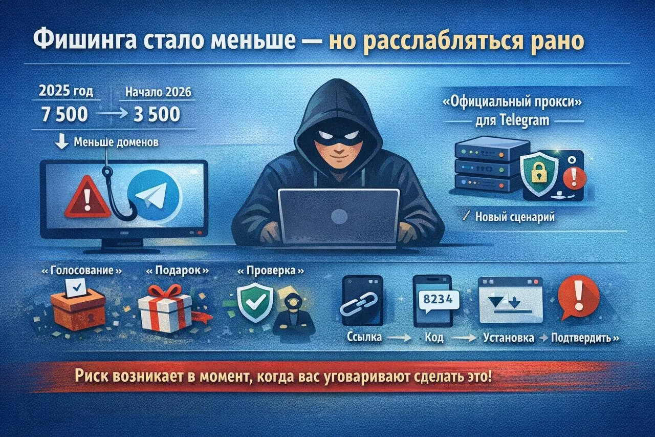 По оценкам экспертов, в первом квартале 2026 года количество доменов, через которые угоняли аккаунты в Telegram, сократилось более чем вдвое — примерно до 3,5 тыс. против 7,5 тыс. годом ранее.