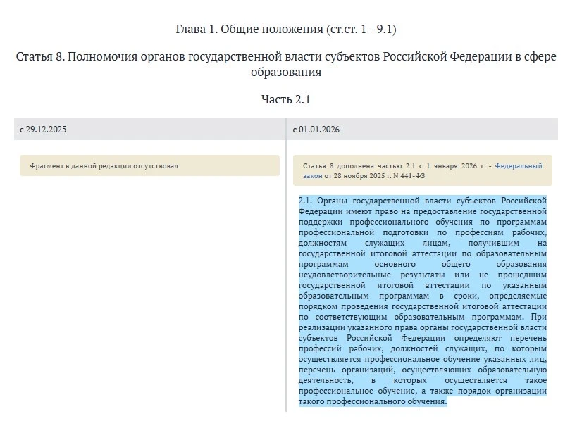 1⃣Так, в главу 1, статью 8 внесли новый пункт 2.1. о праве Органов государственной власти субъектов Российской Федерации на предоставление государственной поддержки профессионального обучения по программам профессиональной подготовки по профессиям рабочих таким выпускникам. Перечень профессий и порядок организации такого обучения субъект определяет самостоятельно.