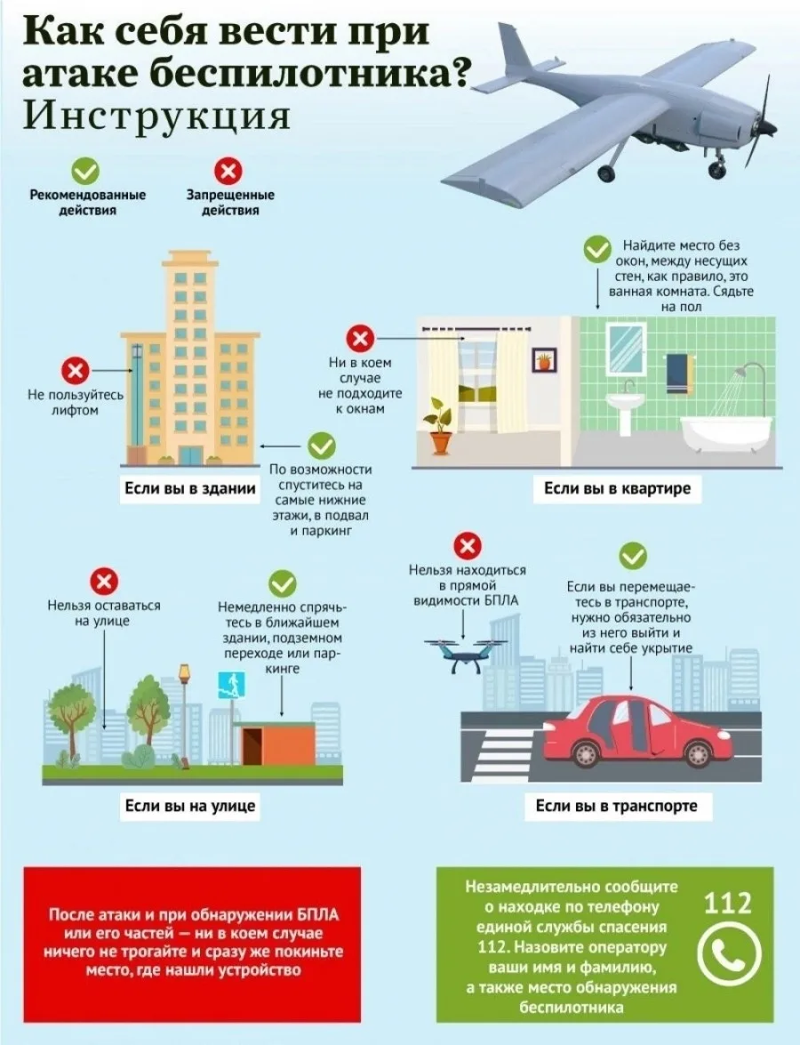 ВАЖНО: не пытайтесь подходить к упавшему БПЛА, чтобы снимать его на фото и видео – это опасно для вашей жизни! Также категорически запрещается размещать фото и видео БПЛА, комментарии о месте происшествия в публичном пространстве (телеграм-каналы, социальные сети, групповые чаты и т. д.). Распространенные вами данные могут быть использованы в экстремистских целях.