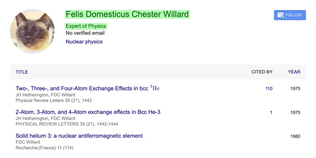 Кот стал соавтором трёх научных статей по физике, одну из которых процитировали более 100 раз.