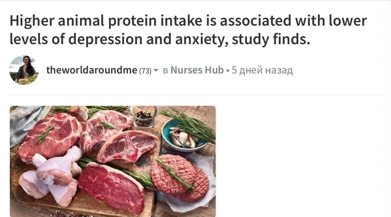 Выяснилось, что люди, которые ели больше всего мяса, на 27% реже страдали от тревоги и депрессии. У женщин связь оказалась ещё сильнее — риск бед с башкой снижался на 40%.