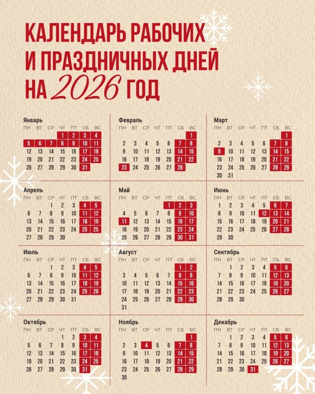 Календарь рабочих и праздничных дней в 2026 году.