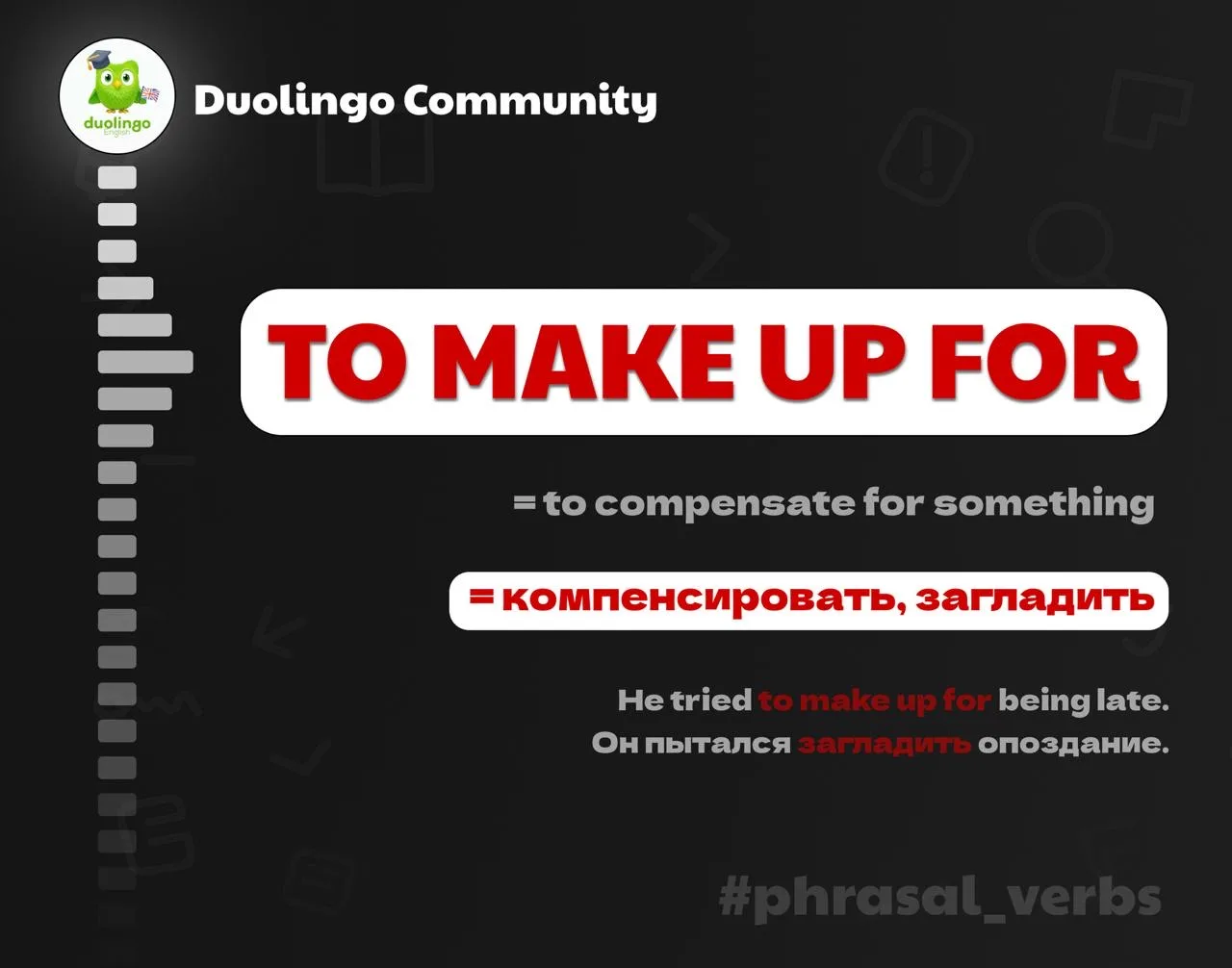 ‼️ Не путать с make up (помириться) или make up (выдумать историю). Make up for = компенсировать, загладить, восполнить.