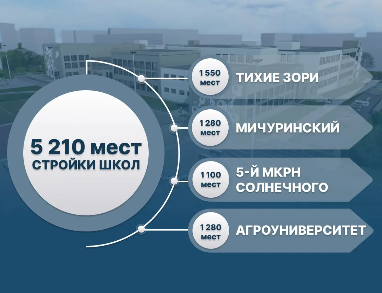 Ближе всего к финишу объект в «Тихих Зорях». Работы завершили на 60%. Следующая на очереди — школа в Мичуринском. До 2028 года откроются учреждения в Солнечном и Агроуниверситете. Суммарно там будут учиться более пяти тысяч ребят.