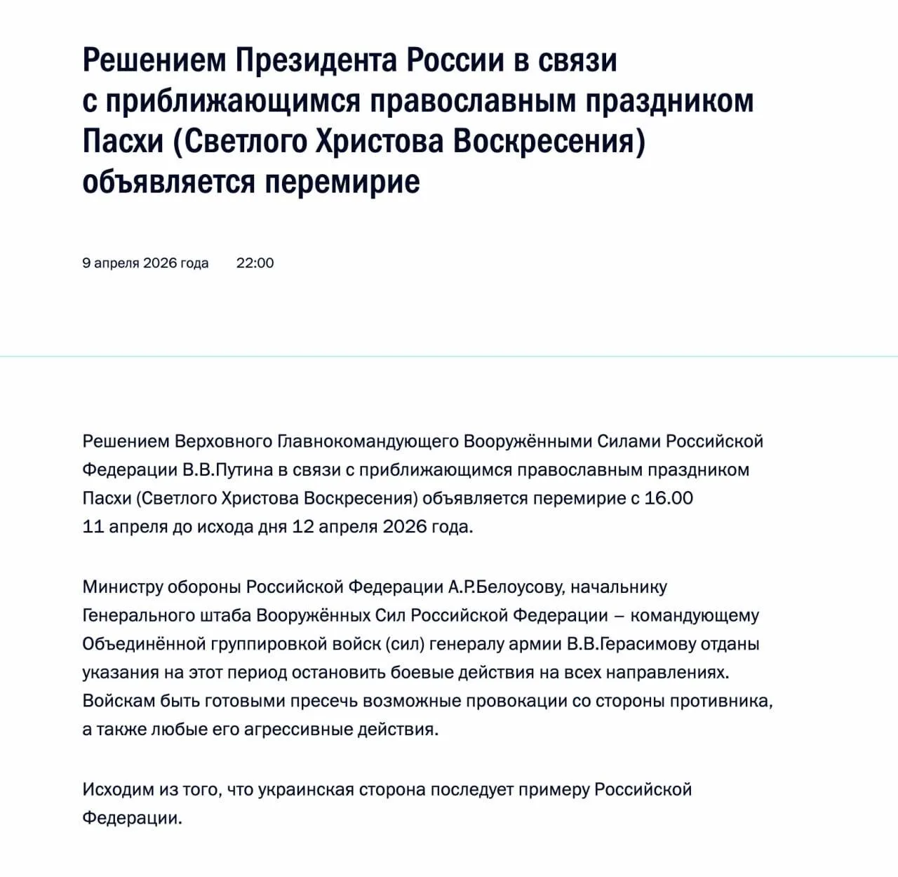 Главе Минобороны Андрею Белоусову и начальнику Генштаба ВС РФ Валерию Герасимову даны указания остановить боевые действия на всех направлениях на период пасхального перемирия.