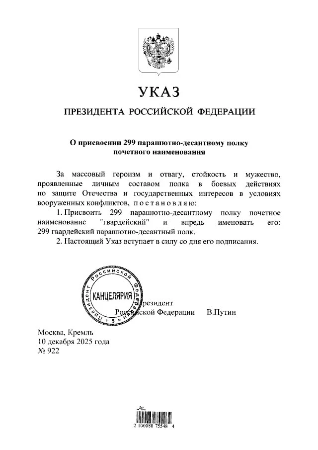 299 парашютно-десантному и 44 инженерно-саперному полкам присвоено почётное наименование "Гвардейские". Соответствующие указы сегодня подписал Владимир Путин.
