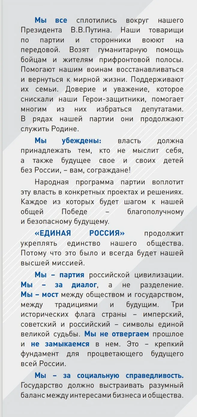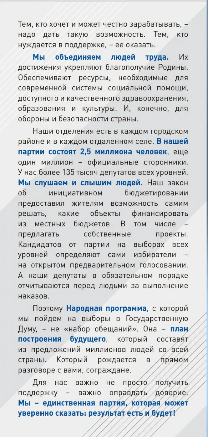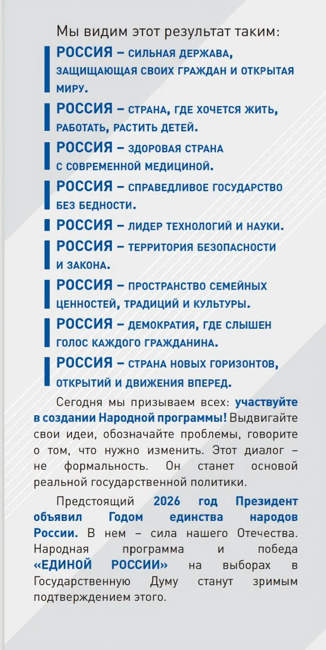 Народная программа партии воплотит власть в конкретных проектах и решениях. Каждое из которых будет шагом к нашей общей Победе — благополучному и безопасному будущему.