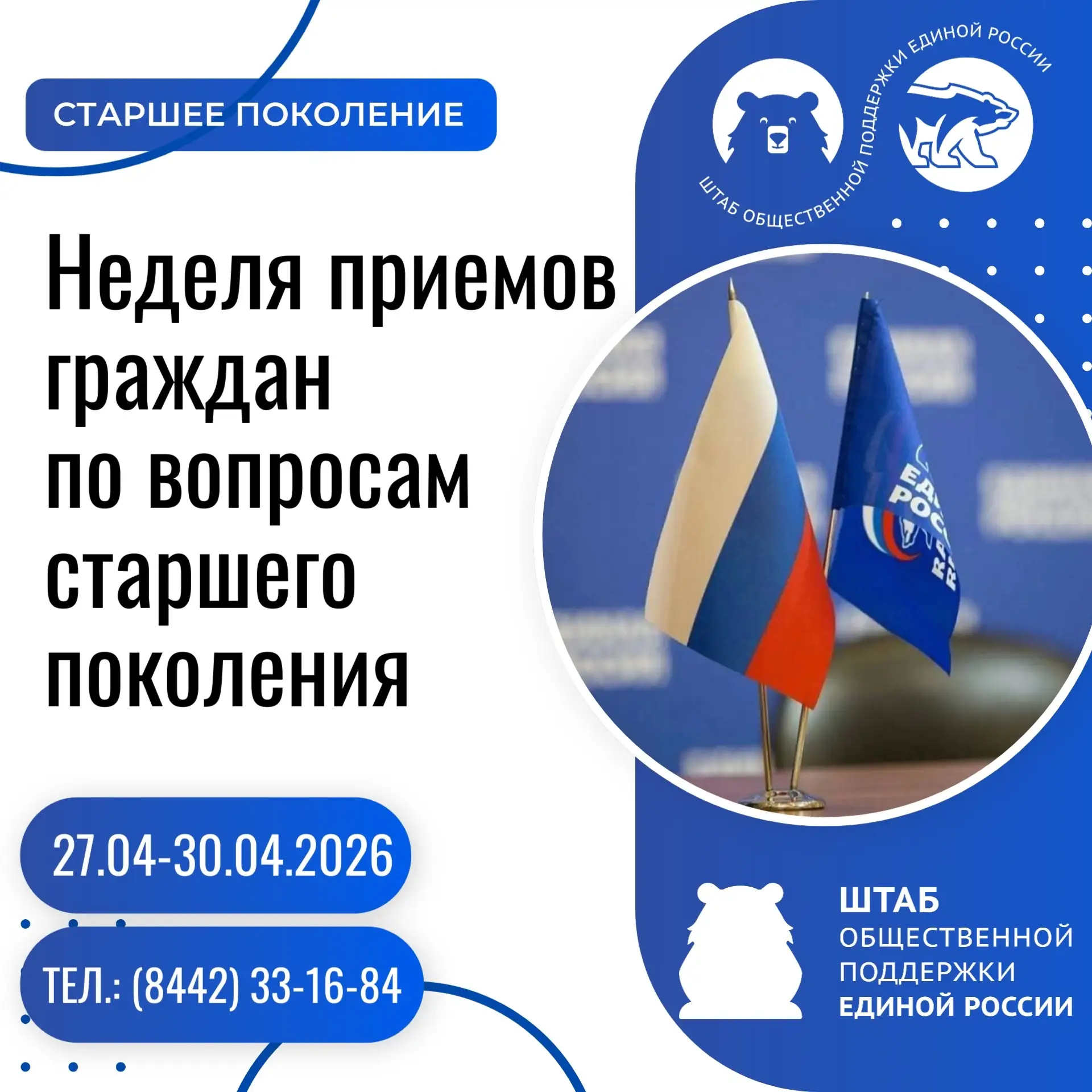 🇷🇺 С 27 по 30 апреля «Единая Россия» проведет Неделю приемов граждан по вопросам старшего поколения.