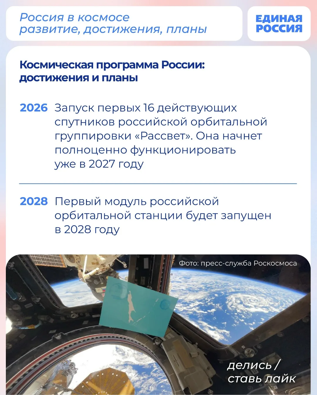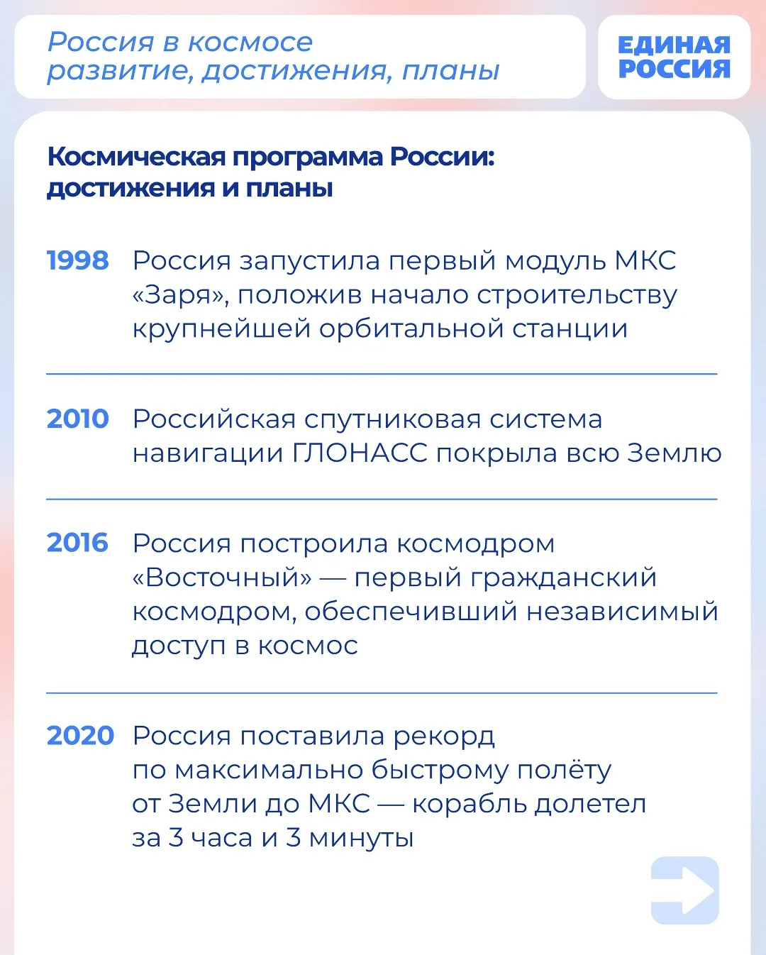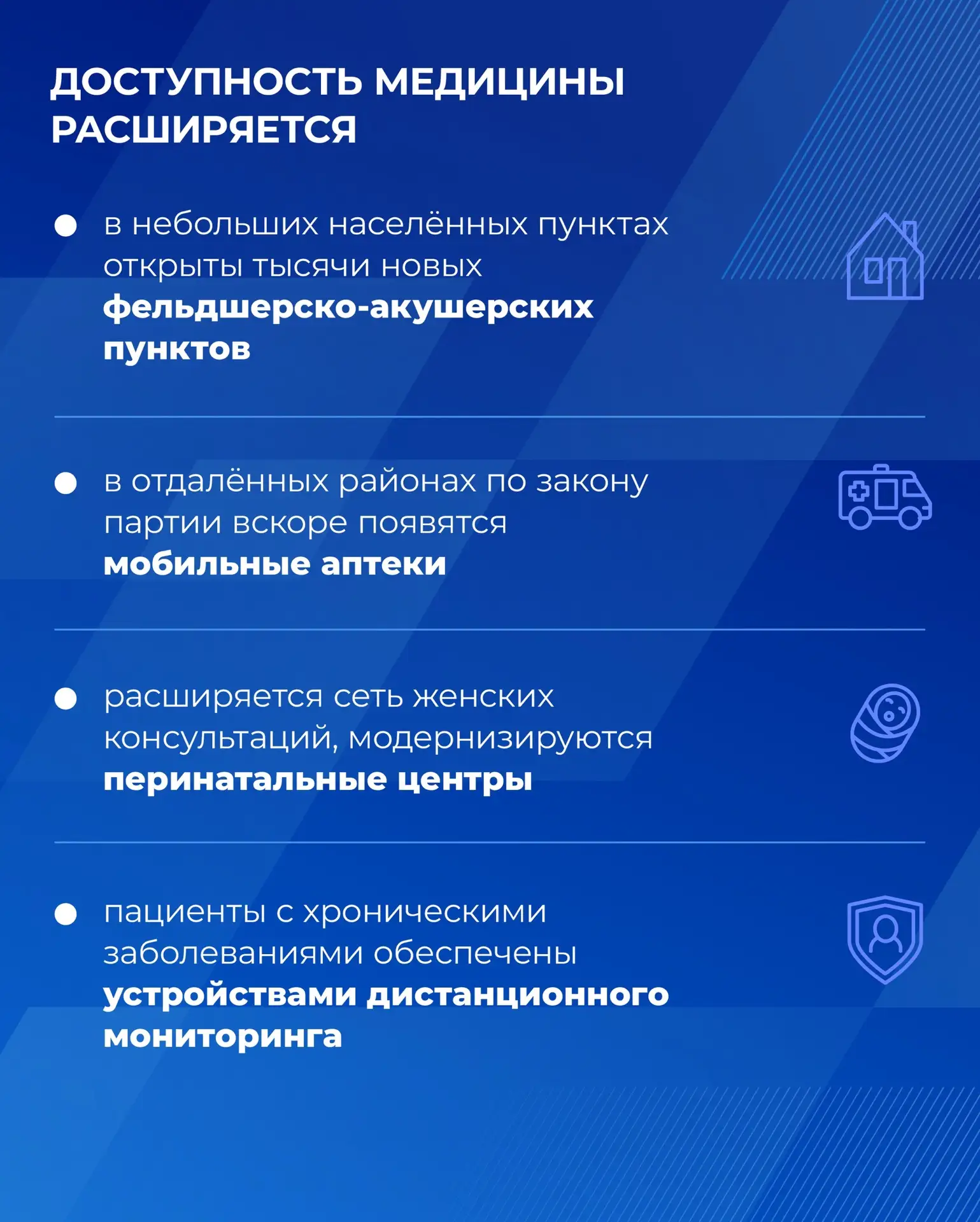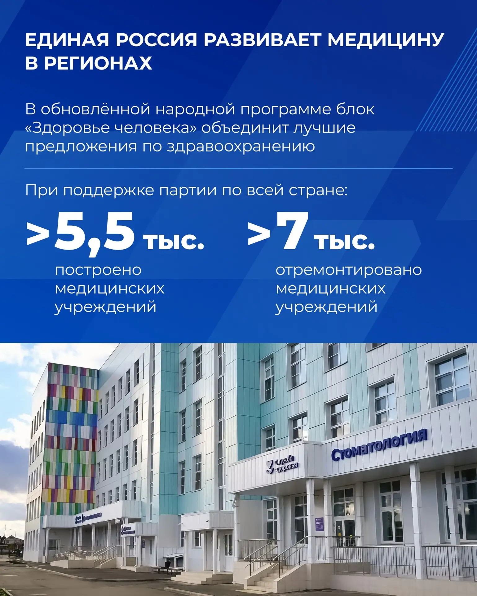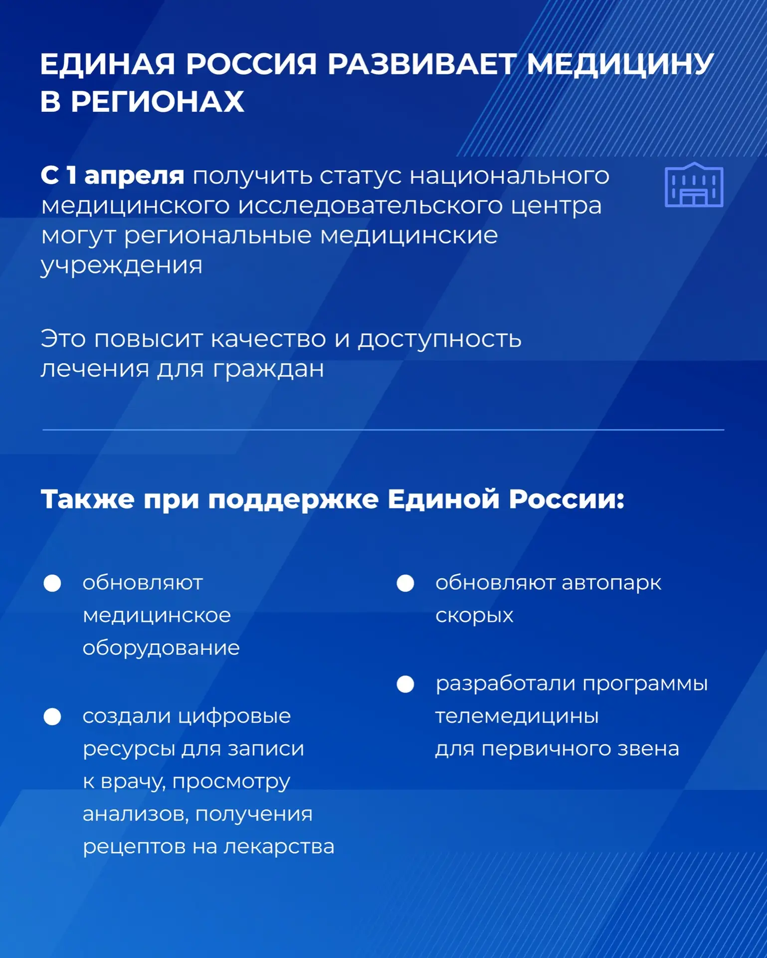 Здоровье — это наша главная ценность. Единая Россия уделяет большое внимание развитию системы здравоохранения в стране. По Народной программе партии строят и ремонтируют больницы и поликлиники, обновляют медицинское оборудование и автопарк скорых. В отдалённых районах по инициативе Единой России вскоре должны появиться мобильные аптеки.