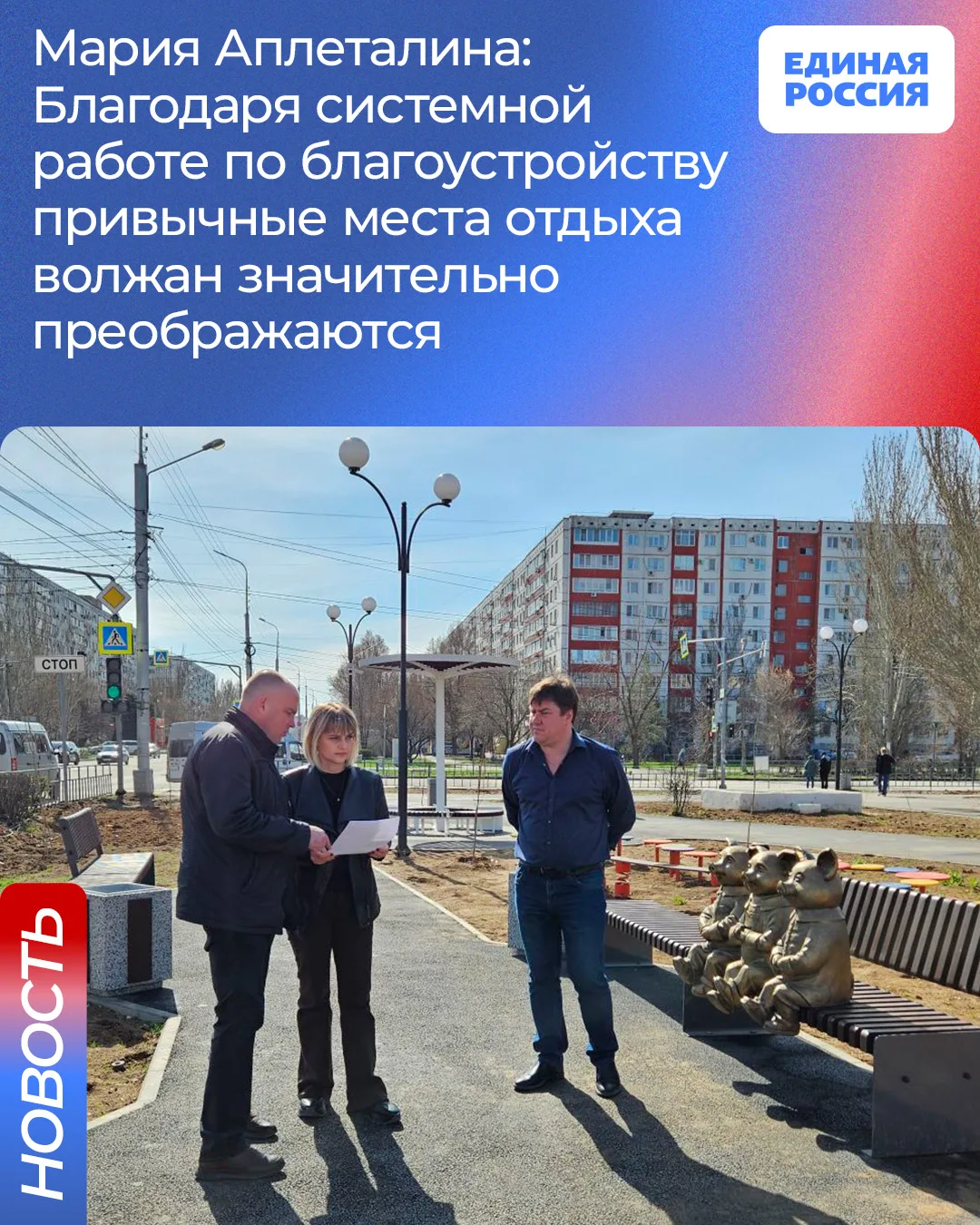 «Территория у поликлиники — яркий пример того, как даже небольшое пространство можно превратить в комфортную среду. Парк "Новый город" станет центром притяжения для молодёжи и семей с детьми. Единая Россия держит благоустройство на постоянном парламентском контроле», прокомментировала депутат Волгоградской областной Думы Мария Аплеталина.