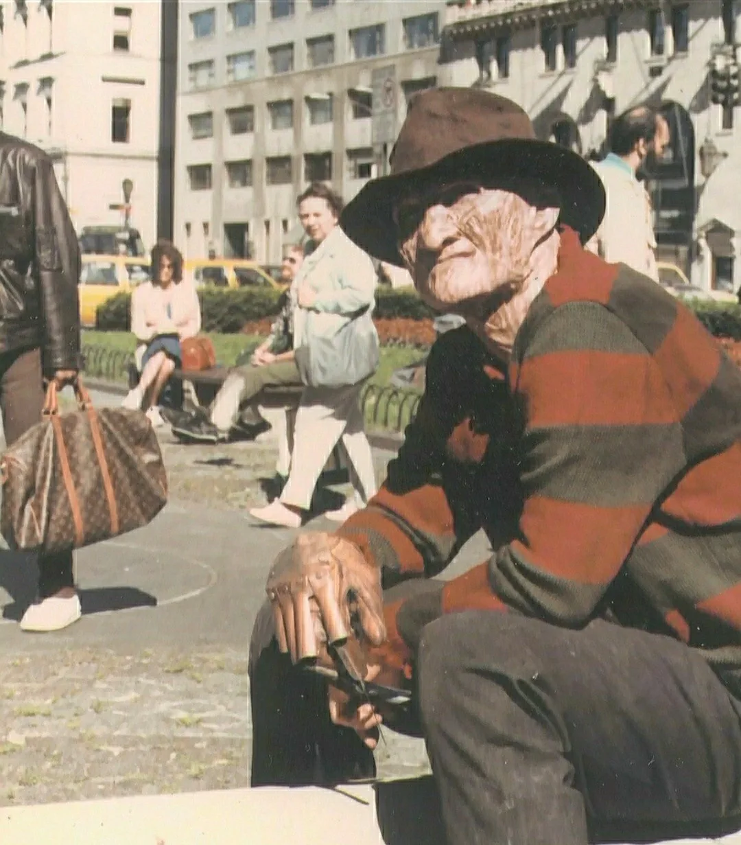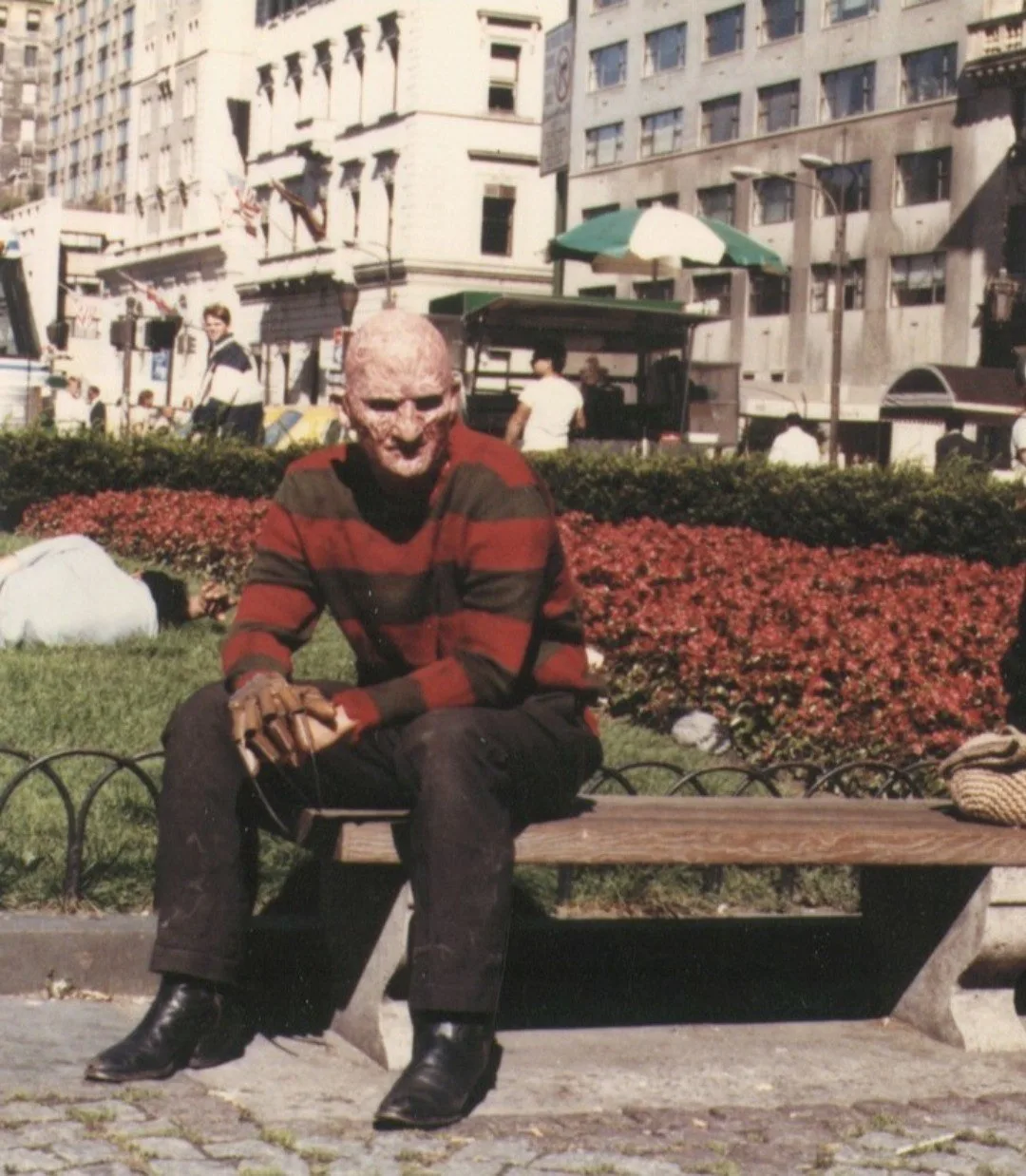 Роберт Инглунд в костюме и гриме Фредди Крюгера отдыхает в общественном парке во время съемок фильма «КОШМАР НА УЛИЦЕ ВЯЗОВ 2: МЕСТЬ ФРЕДДИ» (1985).