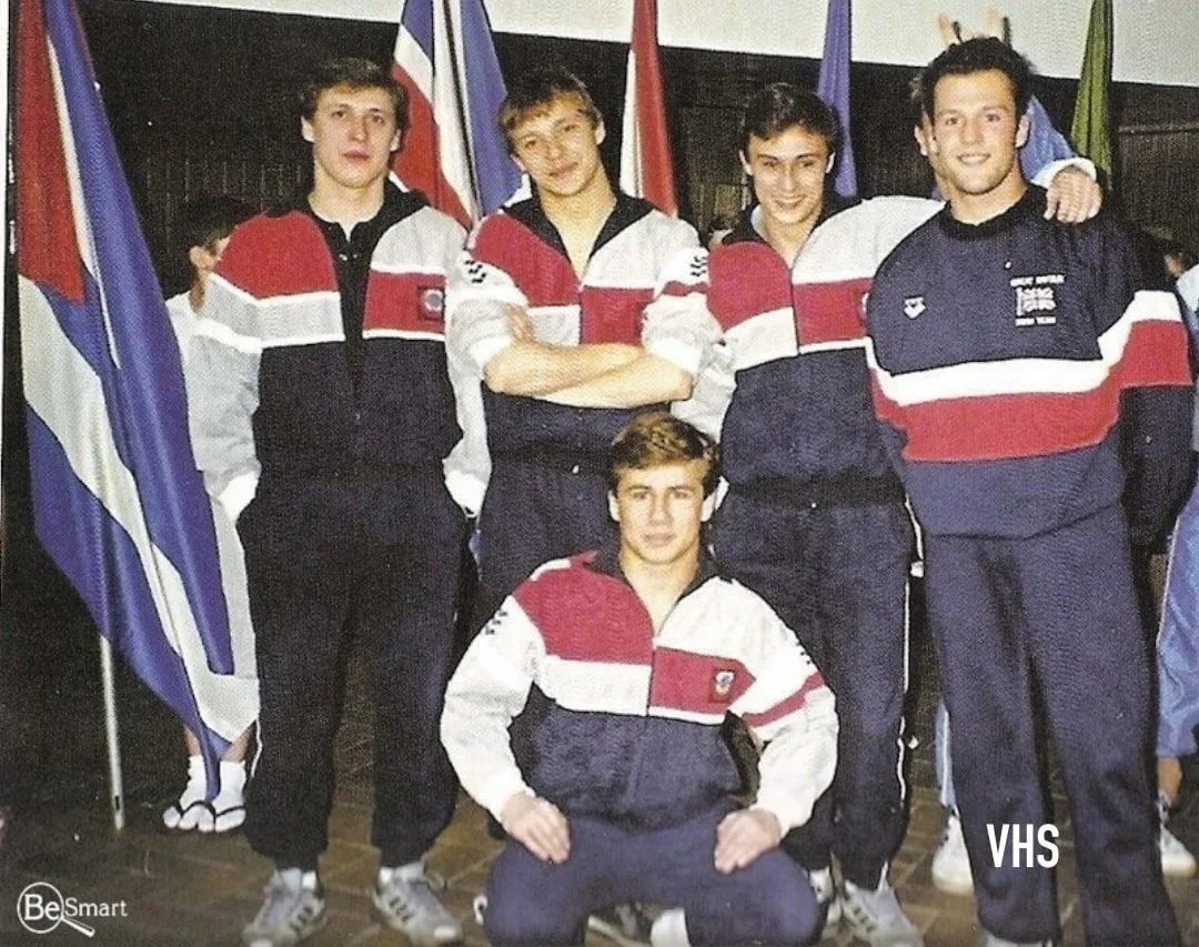 Прыгун в воду из сборной Великобритании Джейсон Стейтем с советскими спортсменами, 1990 год
