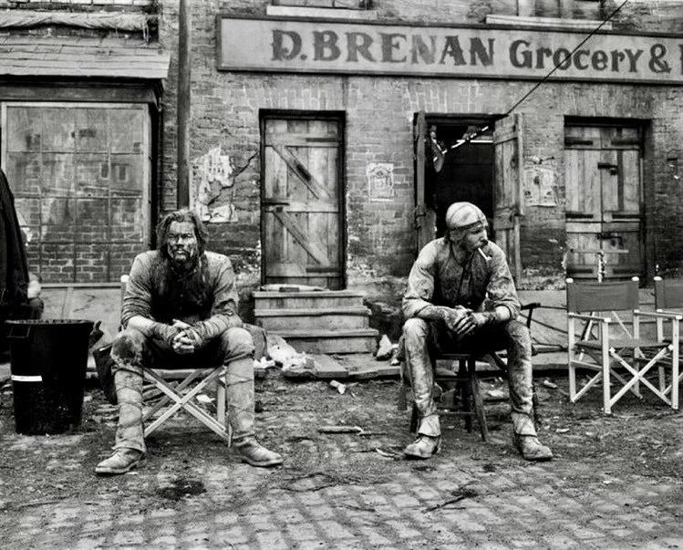 Леонардо Ди Каприо и Дэниел Дэй-Льюис на съемках фильма «Банды Нью-Йорка» (2002) Мартина Скорсезе.
