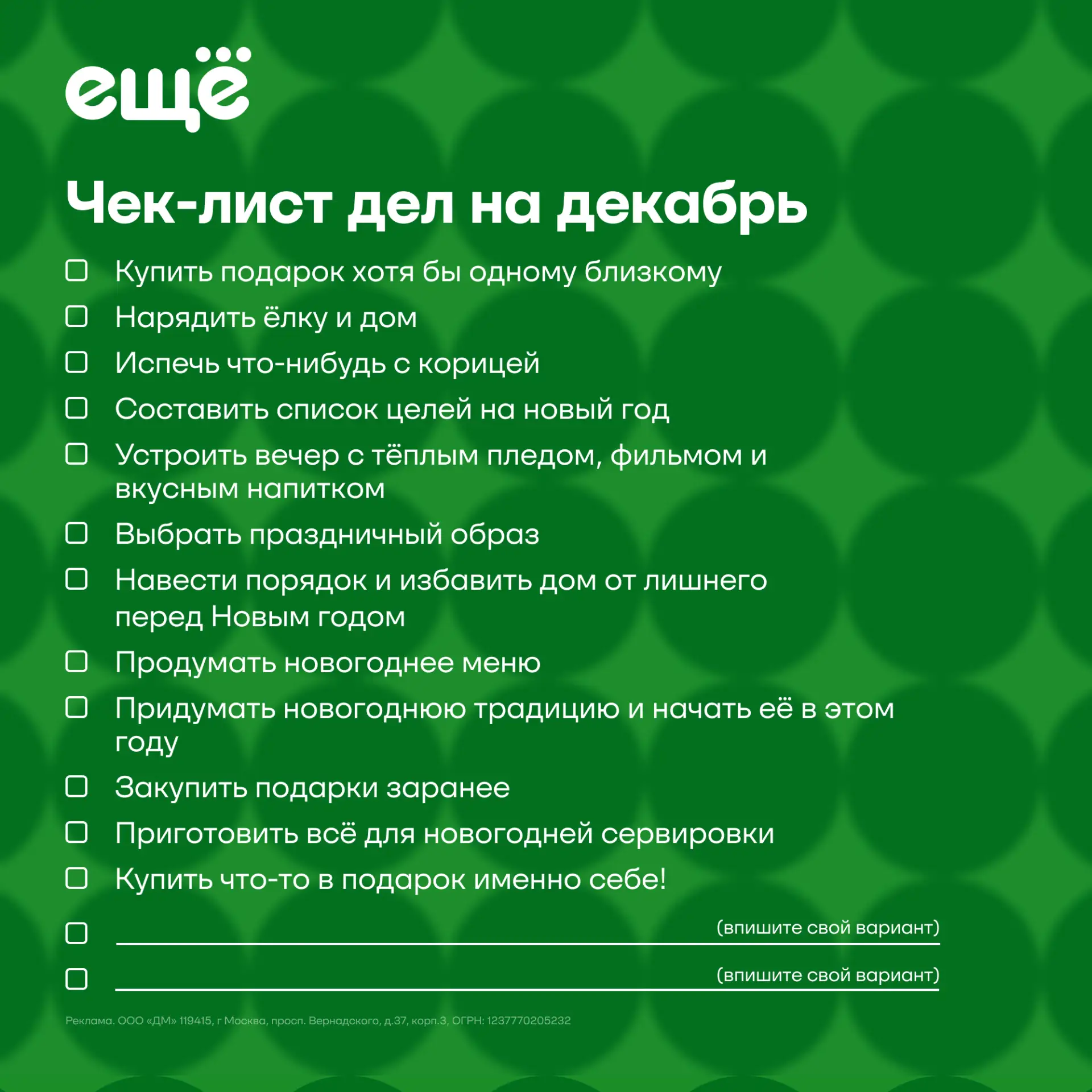 Мы подготовили чек-лист, который поможет ничего не упустить и настроиться на Новый год. Сохраняйте, отмечайте выполненное и создавайте своё праздничное настроение шаг за шагом ☃️