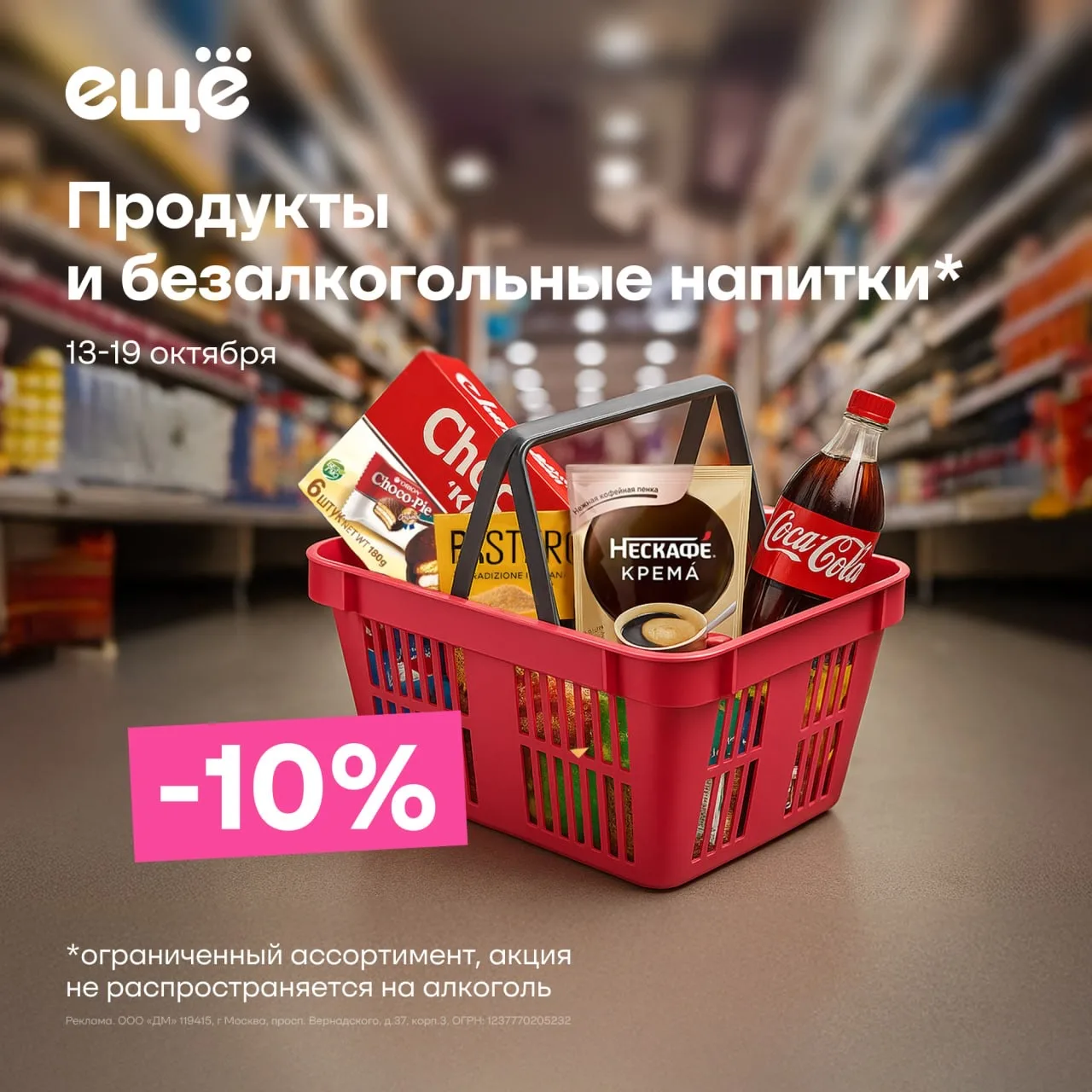 Уже завтра вас ждёт скидка 10% на продукты и безалкогольные напитки в Ещё. Самое время пополнить запасы любимых снеков, сладостей, бакалеи, напитков и много другого. Успейте, пока всё ещё есть в наличии!
