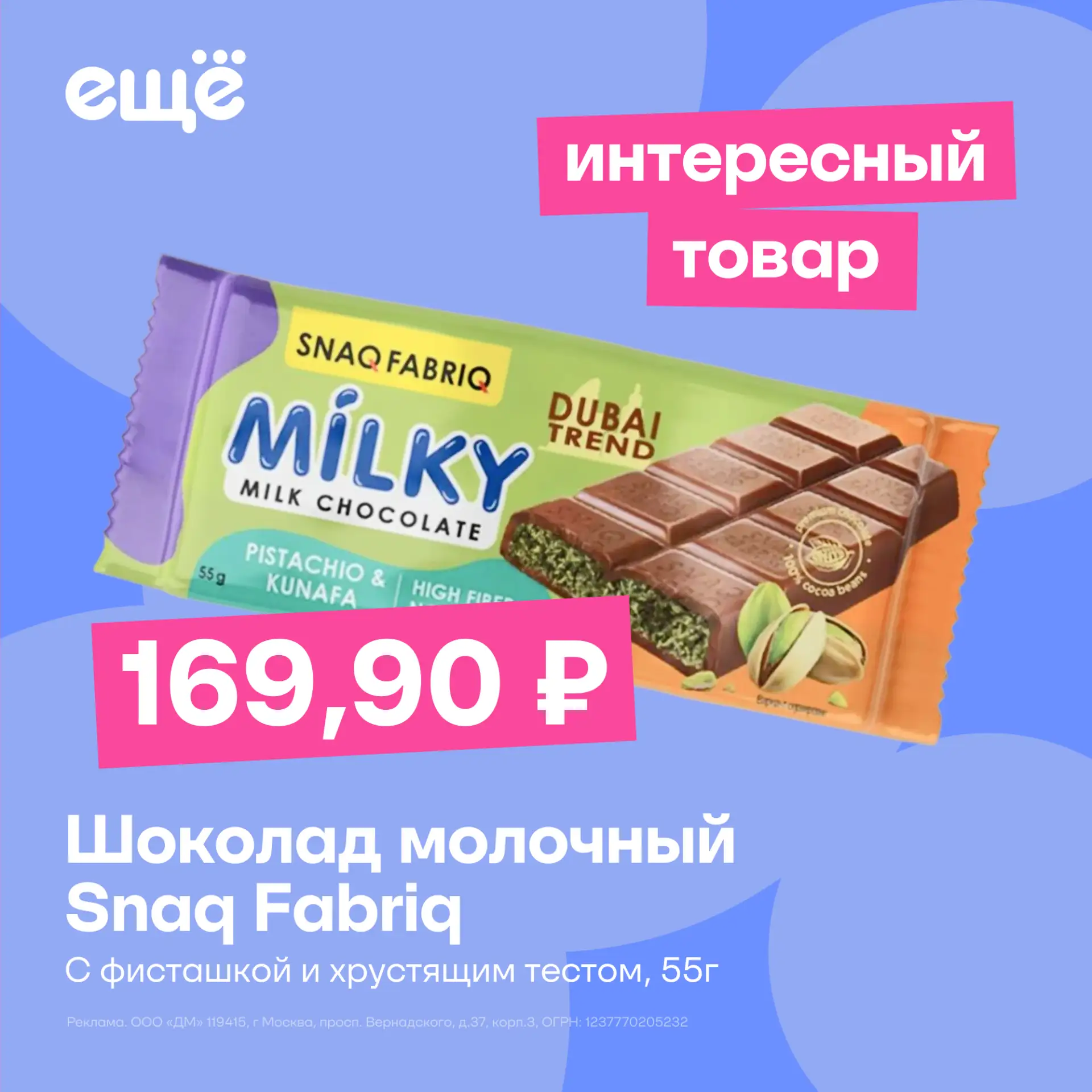 Новинка для любителей сладкого без вреда для фигуры. Молочный шоколад без сахара с фисташкой и хрустящим тестом по мотивам популярного десерта. Приходите в Ещё, чтобы попробовать!