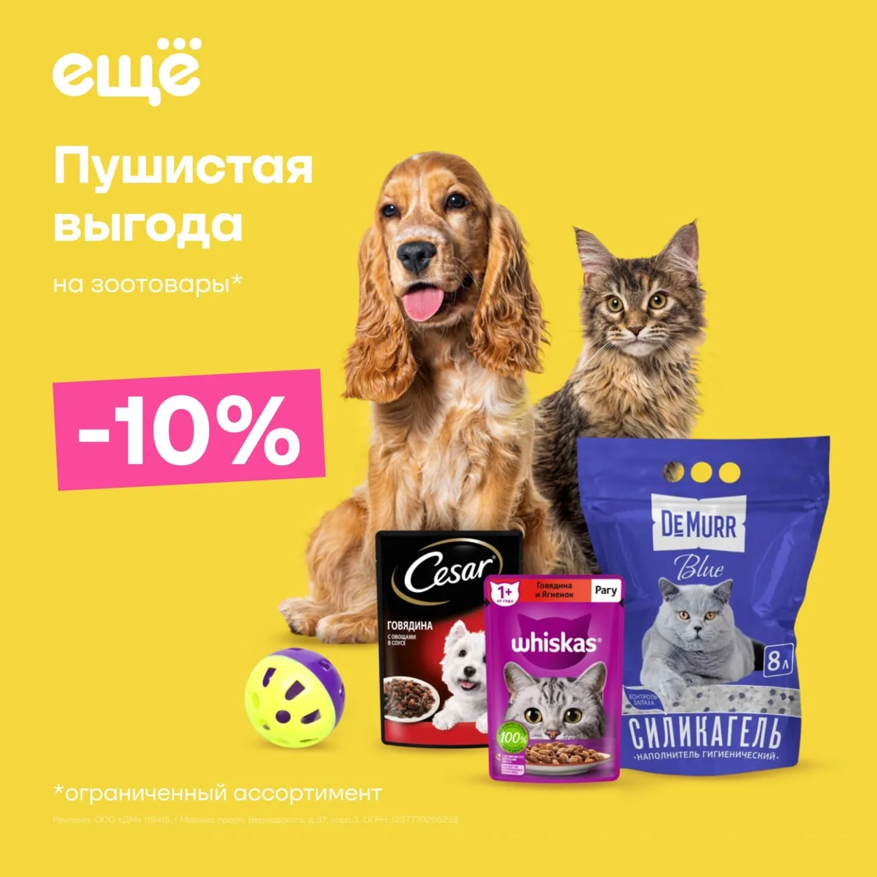 Ещё радует пушистиков и вас приятными ценами на зоотовары: покупайте корма, любимые лакомства, игрушки, товары для ухода за животными и многое другое в Ещё со скидкой 10%!