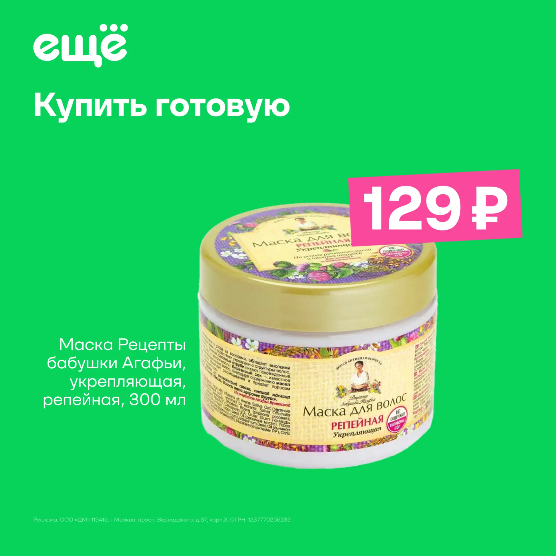 Сделать укрепляющую маску дома своими руками или просто купить репейную маску в Ещё всего за 129 рублей. Что выберете вы?