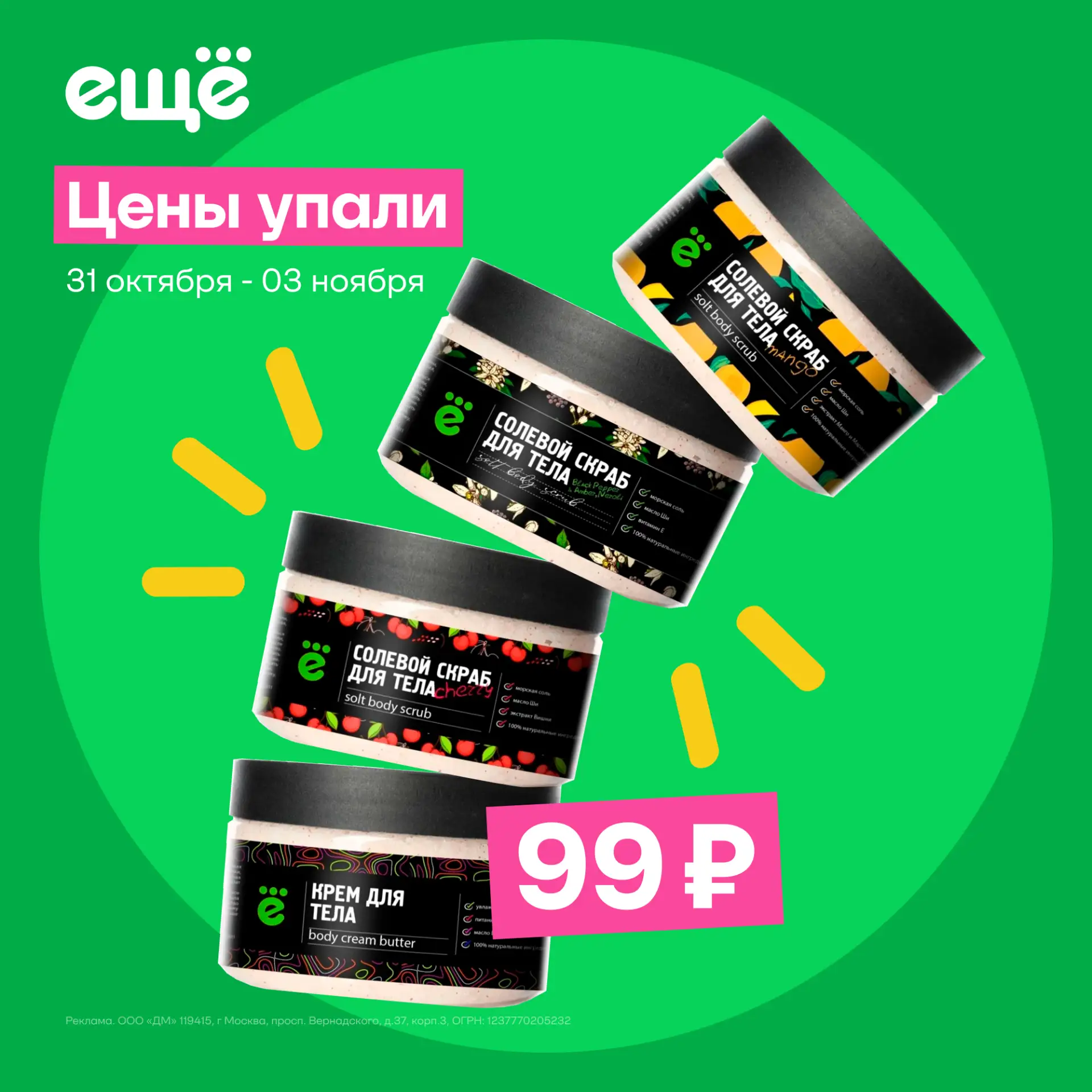 Только с 31 октября по 3 ноября мы снизили цены на уход за кожей: скрабы и крем для тела всего по 99 рублей. Бережный уход, потрясающие ароматы и бархатная кожа – то, что нужно этой осенью!
