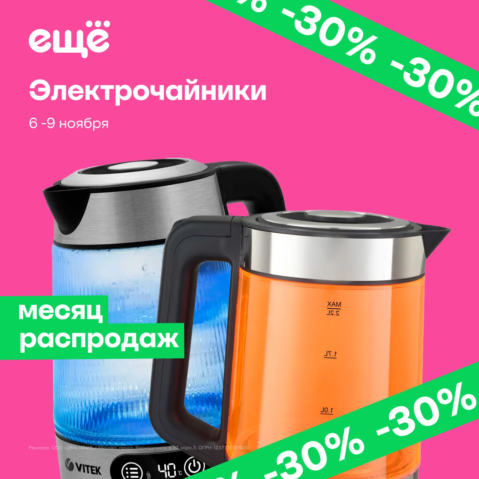 А открывает сезон распродаж акция на электрочайники: только с 6 по 9 ноября скидка 30%. Самое время обновить технику: выбирайте новый электрочайник и наслаждайтесь горячими напитками каждый день!
