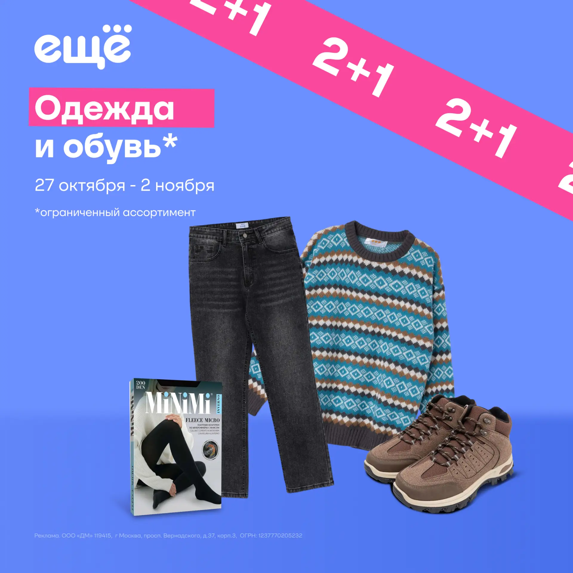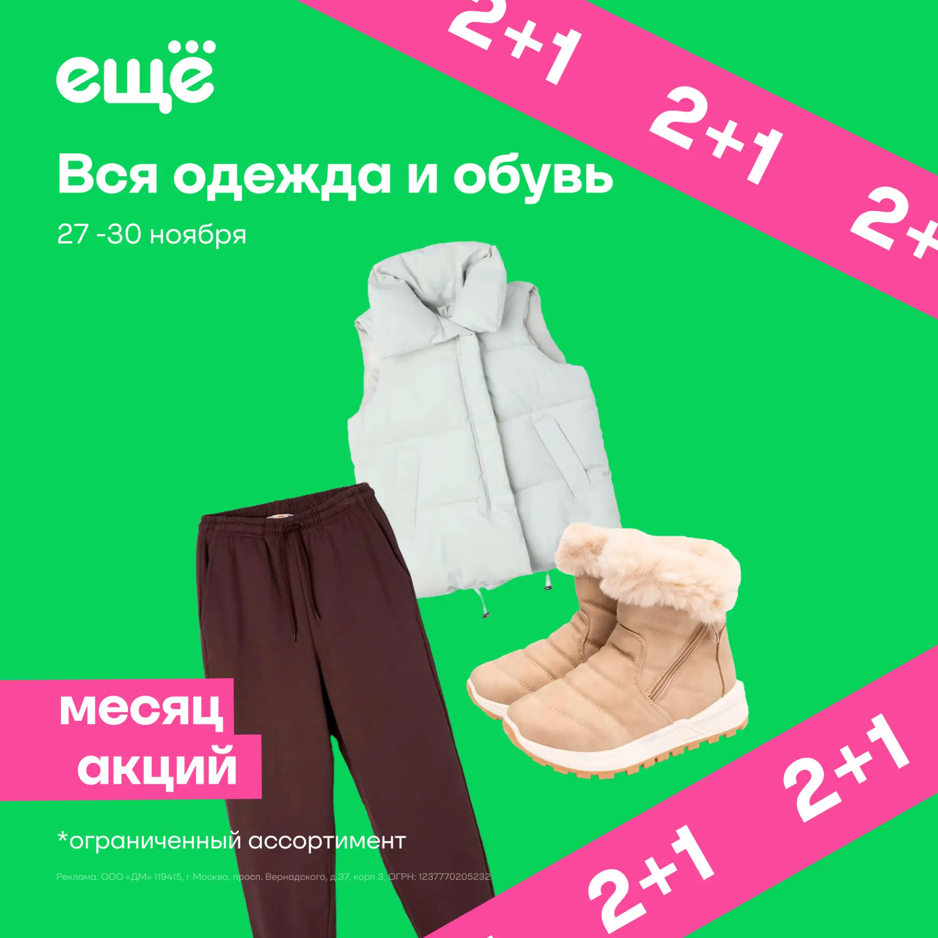 Сегодня в Ещё стартовала акция 2+1 на одежду и обувь: выбирайте любые три вещи, а третья достанется вам в подарок!