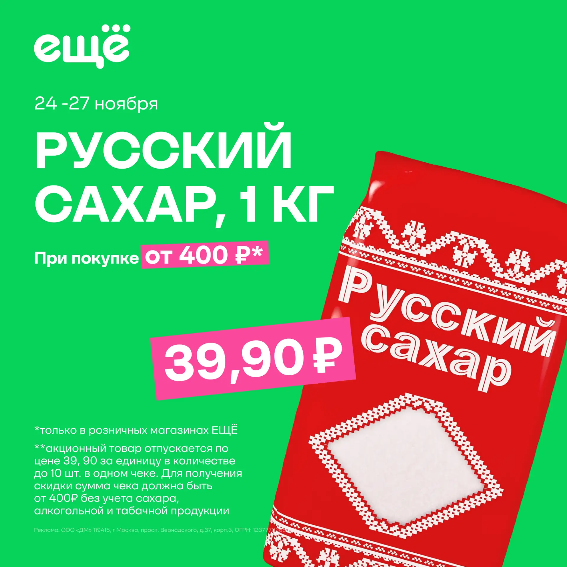 Только с 24 по 27 ноября в магазинах Ещё цена на «Русский сахар» всего 39,90 рублей за килограмм при покупке товаров на 400 рублей без учёта сахара. Поторопитесь!