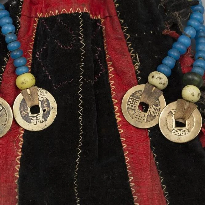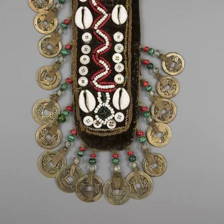 Для тофаларского костюма характерно, что мужская и женская одежда подпоясывалась куском ткани длиной 1,5–2 м. На спине за пояс закладывали нож в ножнах. С правой стороны спереди подвешивали кисеты и футляр с трубкой. Китайские монеты, поступавшие в Иркутскую губ. вместе с товарами китайского производства, вероятно, в ряде случаев заменяли собой традиционные круглые медные бляхи и высоко ценились. Китайские монеты – распространенный элемент украшений и аксессуаров народов Южной Сибири. Кроме того, их форма и способ крепления к предметам (ремешок и отверстие) символизировали собой сочетание мужского и женского начала, а, соответственно, магию плодородия. В этих предметах монеты расположены так, чтобы они издавали звон при ходьбе, что усиливало обережную функцию этих предметов.