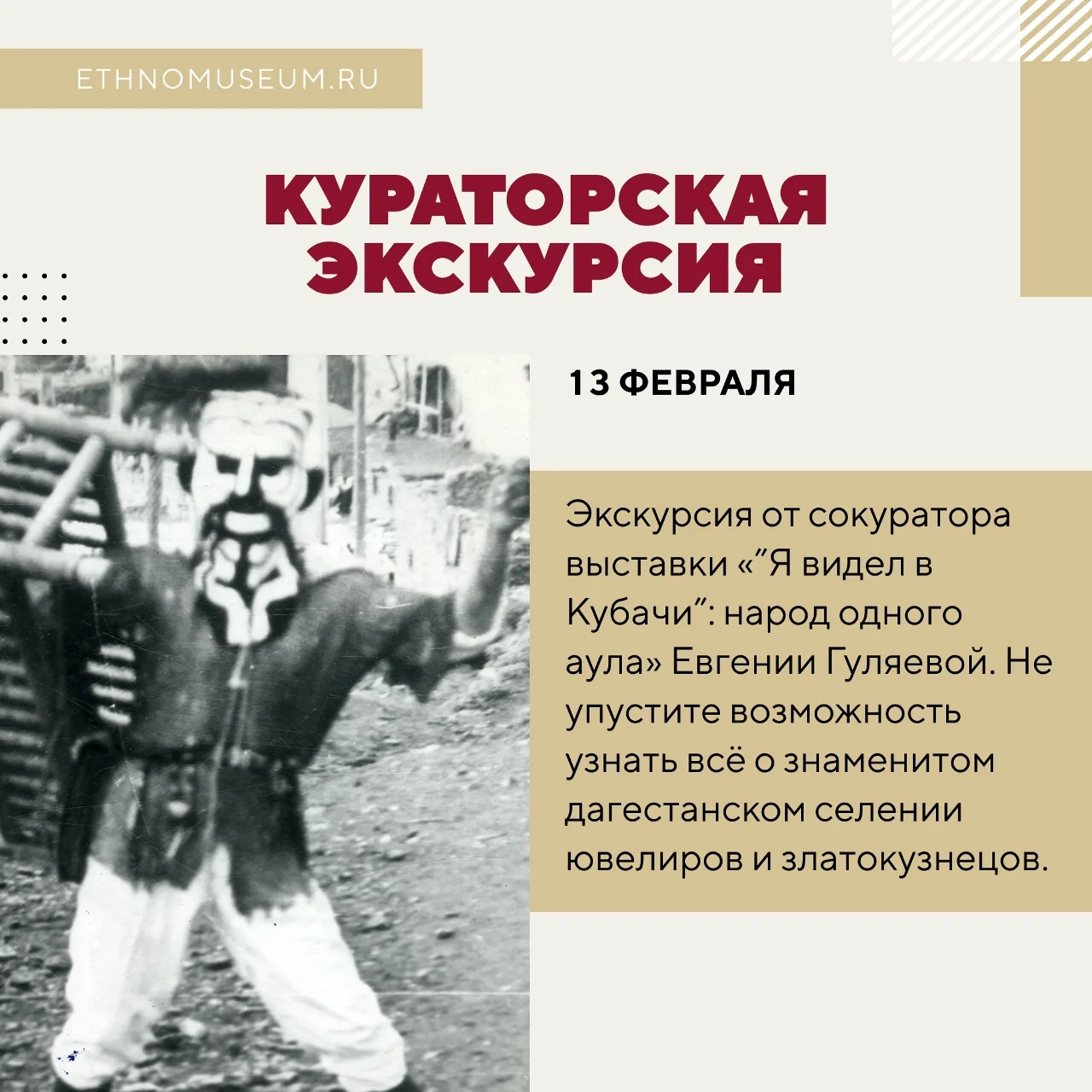 24 января ждем вас на программе «Серебряная песня гор», приуроченной ко дню рождения Республики Дагестан. На выставке «“Я видел в Кубачи”: народ одного аула» познакомимся с современной жизнью Кубачи — знаменитого дагестанского селения ювелиров и златокузнецов
