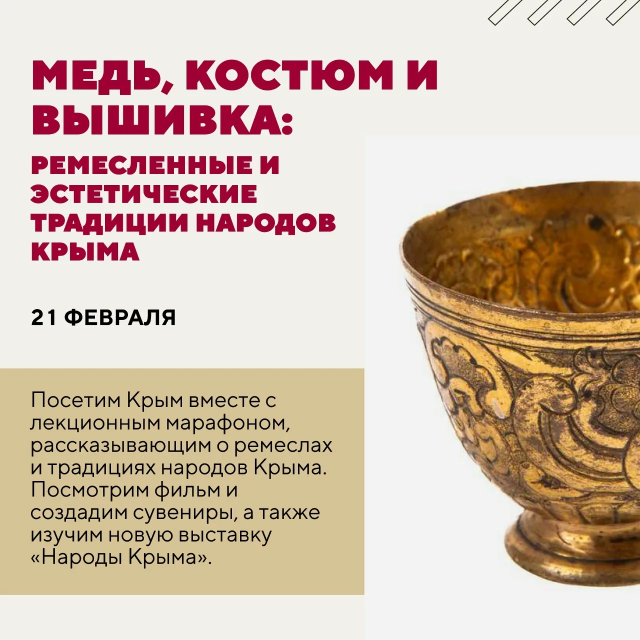 🔻07.04.2026 – «"Дороже золота": золотошвейное искусство народов Поволжья». Лектор – Александра Песецкая, ведущий научный сотрудник отдела этнографии Поволжья и Приуралья.