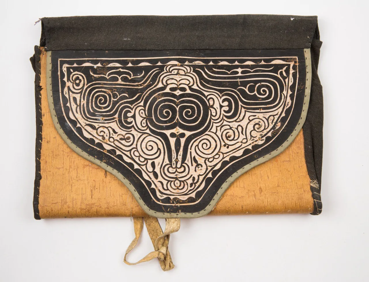 Сумочка прямоугольная в форме портфельчика, сшита из бересты и ткани с орнаментированным клапаном. В орнаменте спиралевидные узоры черного цвета на белом фоне и в центре морда медведя. Образ медведя воспринимался как тотемный предок рода. Сумочка использовалась как женская принадлежность для рукоделия.