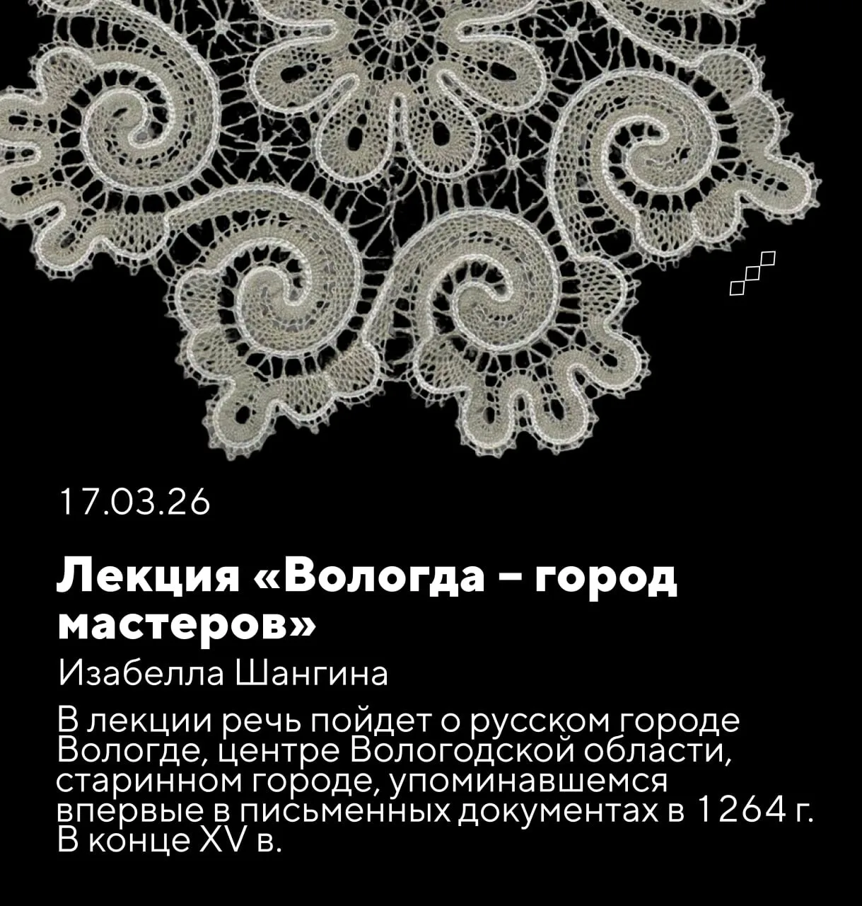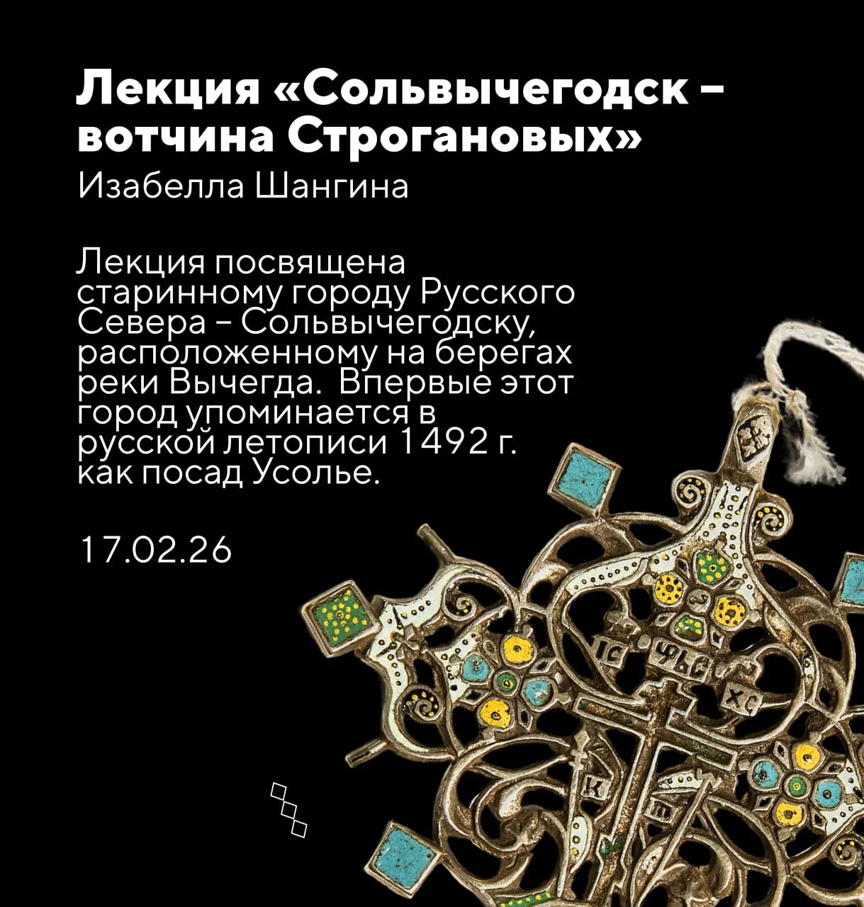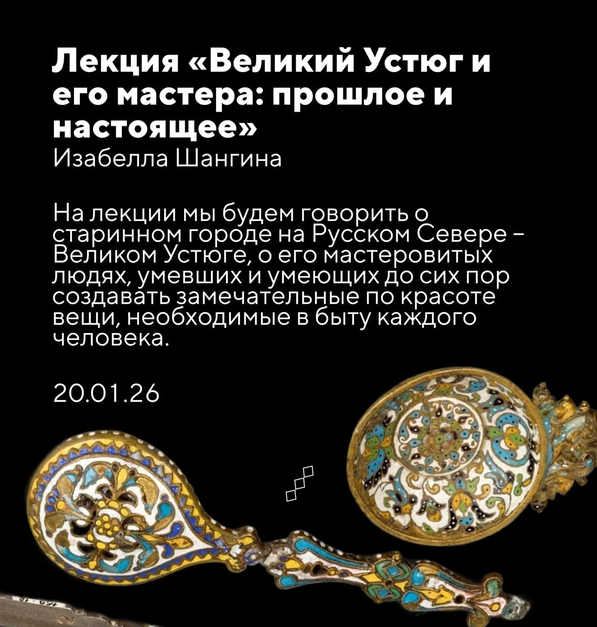 В связи с болезнью лектора отменяется завтрашняя лекция Изабеллы Шангиной «Великий Устюг и его мастера: прошлое и настоящее».