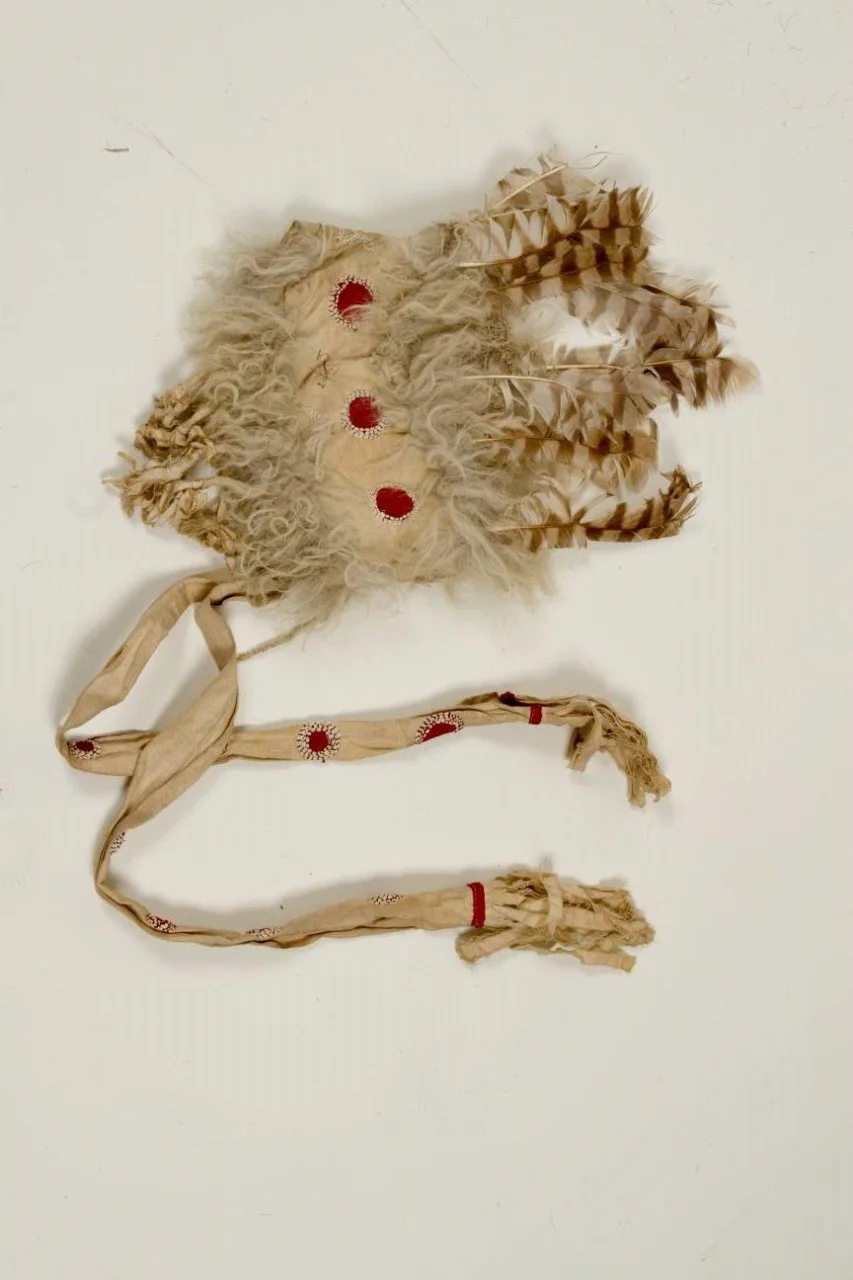 Венчает образ головной убор, представляющий собой широкую повязку с перьями филина и матерчатыми жгутами. На его передней части подшейным волосом оленя вышиты брови, глаза, нос и рот — это «лицо» духа-предка, покровителя шамана.