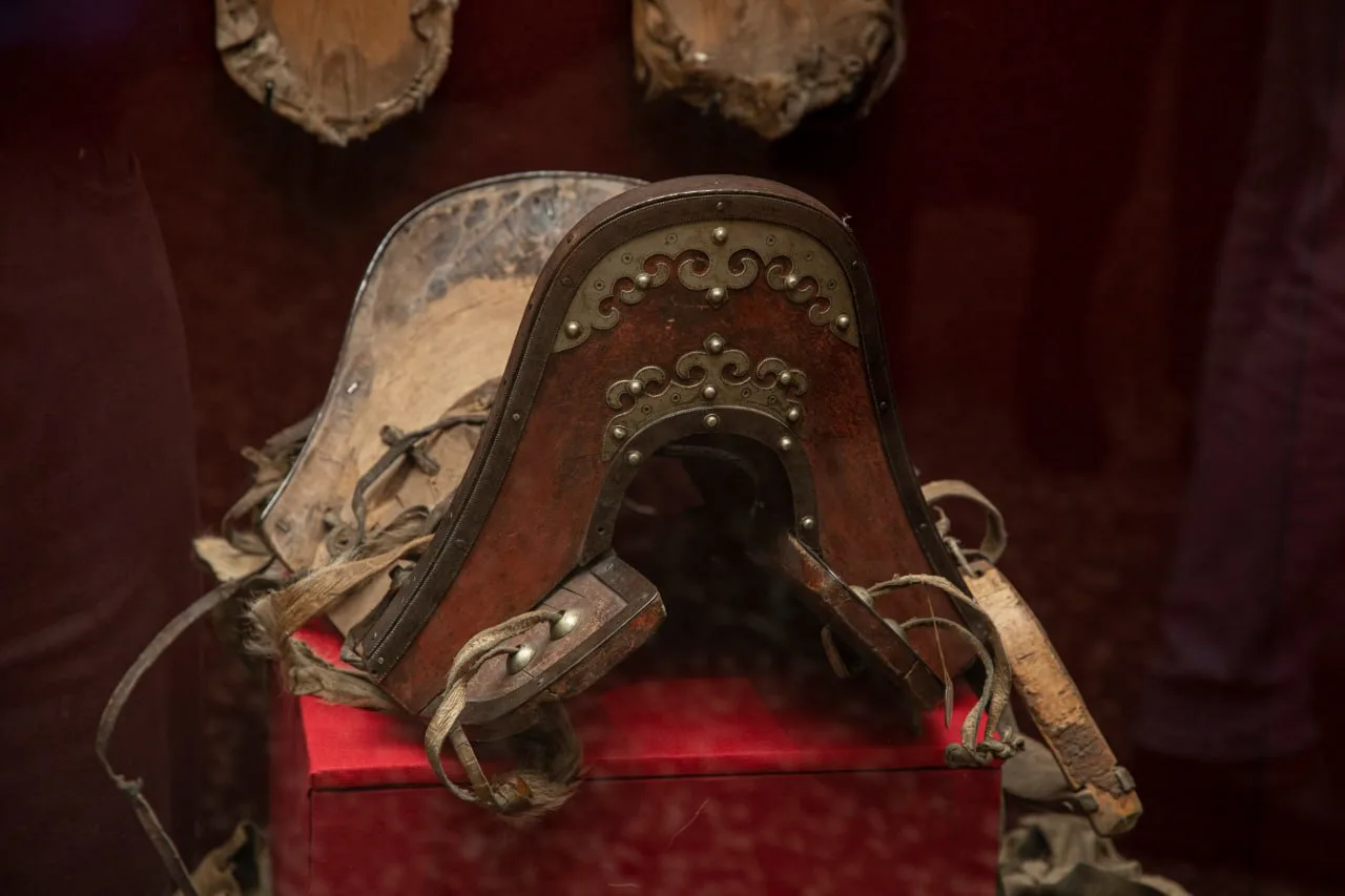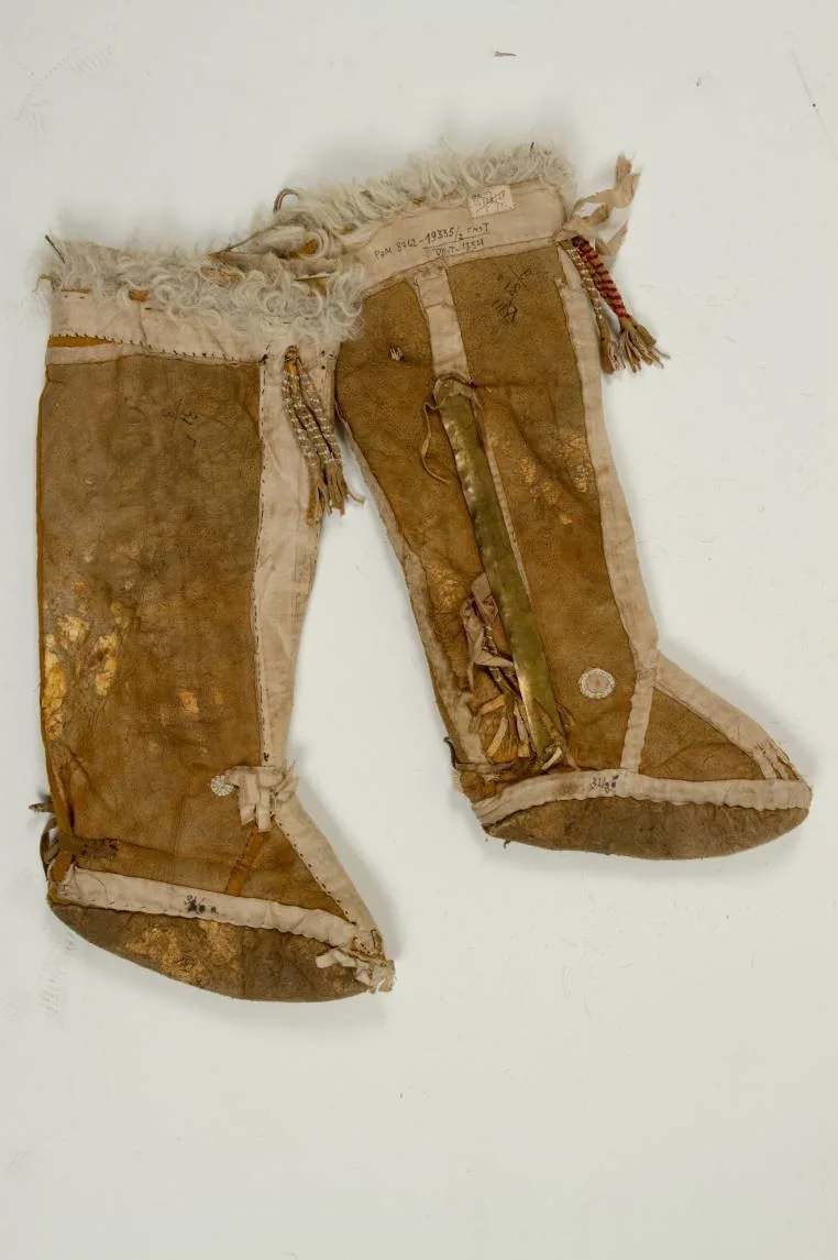 Шаманский костюм из оленьей шкуры — это сложный символический объект, в создании которого традиционно участвовал весь род. Его центральный мотив — «оживший скелет»: аппликации из ткани на кафтане и обуви детально изображают кости, ребра и суставы. При каждом движении шамана костюм буквально «звучит» благодаря множеству металлических подвесок, колокольчиков и жестяных птиц, олицетворяющих духов-помощников.